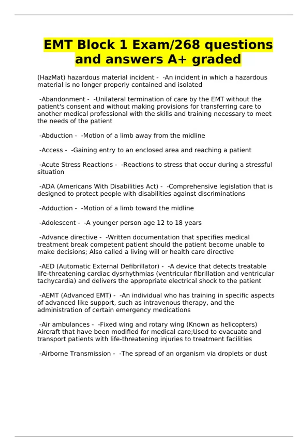 EMT Block 1 Exam/268 questions and answers A+ graded