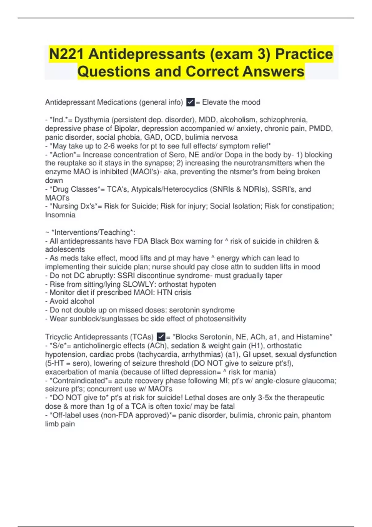 N221 Antidepressants (exam 3) Practice Questions and Correct Answers