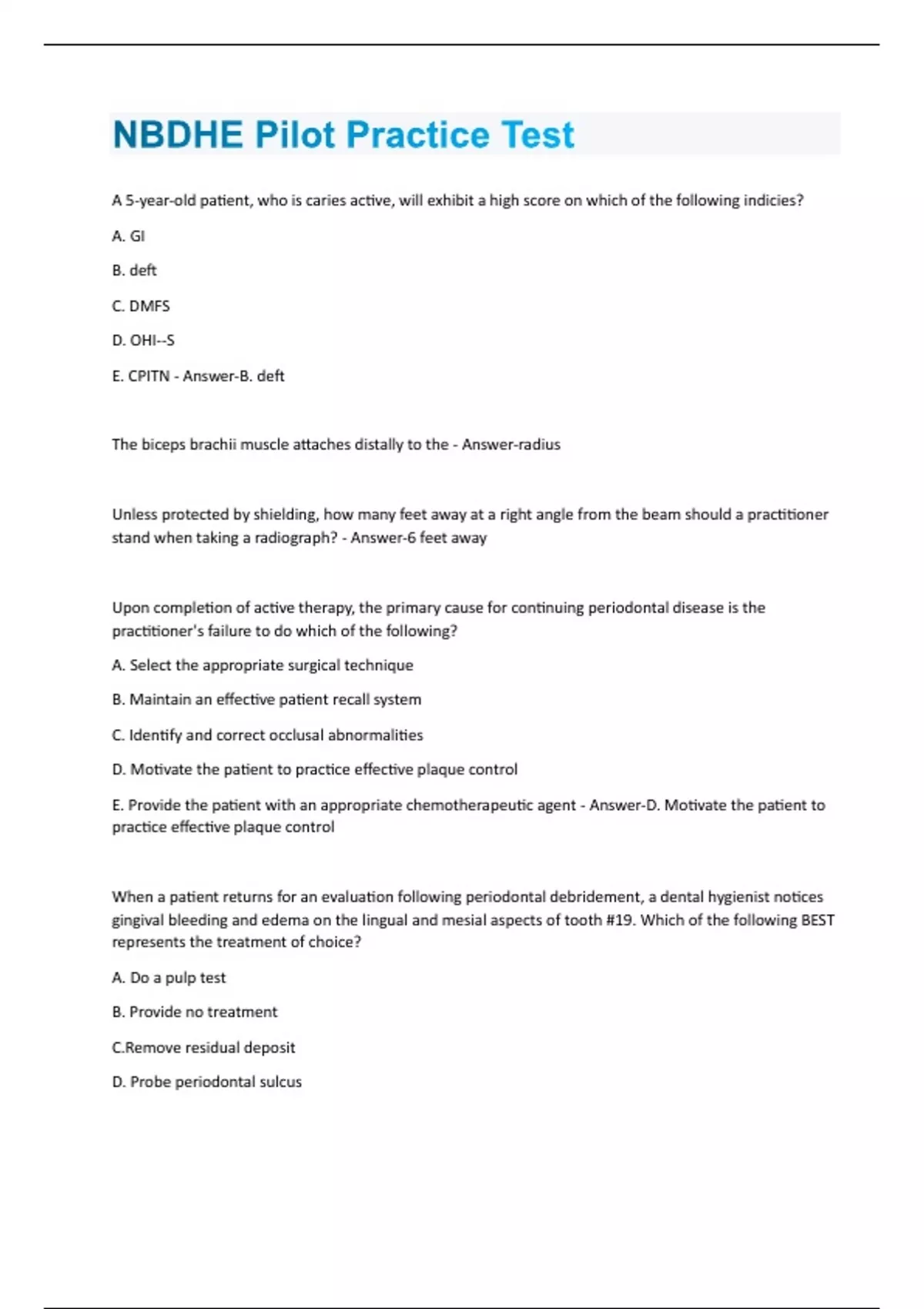 A 5-year-old patient, who is caries active, will exhibit a high score on which of the following indicies? A. GI B. deft C. DMFS D. OHI--S E. CPITN - Answer-B. deft The biceps brachii muscle attaches distally to the - Answer-radius Unless protected by shielding, how many feet away at a right angle from the beam should a practitioner stand when taking a radiograph? - Answer-6 feet away Upon completion of active therapy, the primary cause for continuing periodontal disease is the practitioner's failure to do which of the following? A. Select the appropriate surgical technique B. Maintain an effective patient recall system C. Identify and correct occlusal abnormalities D. Motivate the patient to practice effective plaque control E. Provide the patient with an appropriate chemotherapeutic agent - Answer-D. Motivate the patient to practice effective plaque control When a patient returns for an evaluation following periodontal debridement, a dental hygienist notices gingival bleeding and edema on the lingual and mesial aspects of tooth #19. Which of the following BEST represents the treatment of choice? A. Do a pulp test B. Provide no treatment C.Remove residual deposit D. Probe periodontal sulcusE. Take periapical radiographs - Answer-C. Remove residual deposit Which of the following activities is MOST likely to facilitate learning? A. Viewing a film B. Reading journals C. Listening to a debate D. Dramatizing a situation E. Participating in a experience - AnswerWhich of the following can BEST be evaluated when reviewing bitewing radiographs? - AnswerInterproximal caries Which of the following hormones is released in response to hyperglycemia? - Answer-Blood glucose!!! Not insulin