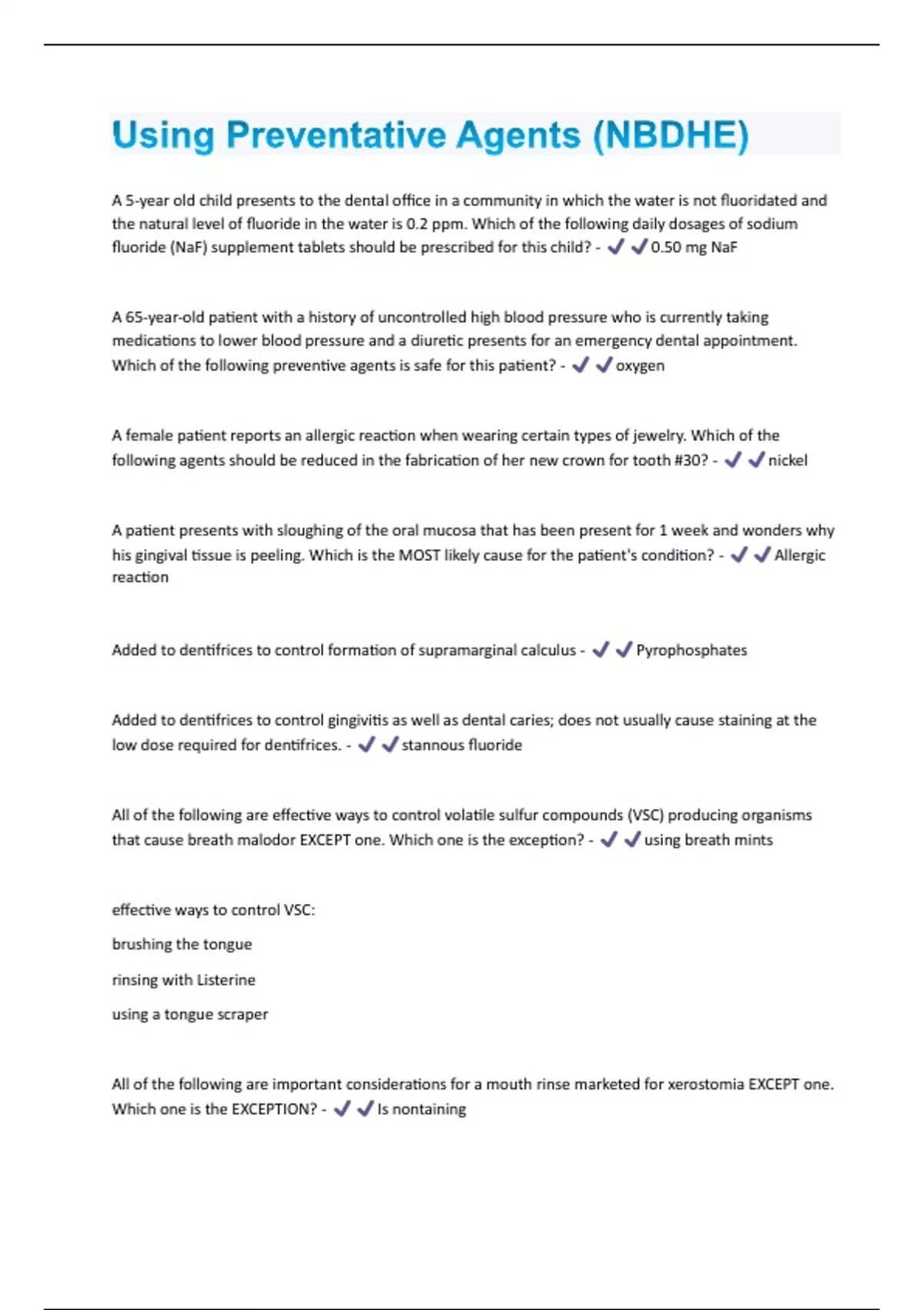 A 5-year old child presents to the dental office in a community in which the water is not fluoridated and the natural level of fluoride in the water is 0.2 ppm. Which of the following daily dosages of sodium fluoride (NaF) supplement tablets should be prescribed for this child? - 0.50 mg NaF A 65-year-old patient with a history of uncontrolled high blood pressure who is currently taking medications to lower blood pressure and a diuretic presents for an emergency dental appointment. Which of the following preventive agents is safe for this patient? - oxygen A female patient reports an allergic reaction when wearing certain types of jewelry. Which of the following agents should be reduced in the fabrication of her new crown for tooth #30? - nickel A patient presents with sloughing of the oral mucosa that has been present for 1 week and wonders why his gingival tissue is peeling. Which is the MOST likely cause for the patient's condition? - Allergic reaction Added to dentifrices to control formation of supramarginal calculus - Pyrophosphates Added to dentifrices to control gingivitis as well as dental caries; does not usually cause staining at the low dose required for dentifrices. - stannous fluoride All of the following are effective ways to control volatile sulfur compounds (VSC) producing organisms that cause breath malodor EXCEPT one. Which one is the exception? - using breath mints effective ways to control VSC: brushing the tongue rinsing with Listerine using a tongue scraper All of the following are important considerations for a mouth rinse marketed for xerostomia EXCEPT one. Which one is the EXCEPTION? - Is nontainingimportant considerations for mouth rinses for xerostomia: contains fluoride has lubricating properties has moisturizing qualites All of the following statements are true EXCEPT one. Which one is the EXCEPTION? - The rate of fluorosis is continuing to increase because of the high level of fluoride in children's toothpaste. true statements: fluorosis can be controlled in the population by controlling the risk factor the trend in the united states is an increase in the prevalence of slight fluorosis in children The new CDC recommendation to reduce fluoride levels in water supplies indicates that some public health care professionals consider the level of fluorosis to be a public health problem Amorphous calcium phosphate complex added to prophylaxis paste and professionally dispensed dentifrice to enhance remineralization - MI paste and NuvaMin Broad-spectrum antimicrobial detergent formulation added to dentifrices as an antiplaque, antigingivitis, and antiinflammatory agent - Triclosan Characteristics of patient-centered tobacco cessation communication include all the following EXCEPT one. Which one is the EXCEPTION? - emphasis on expert authority patient-centered tobacco cessation should include: listeningcollaboration eliciting of information Chlorhexidine has been shown to be effective as an antimicrobial to control dental caries in patients who are at high risk for caries. The recommended protocol is the same as that used to control gingivitis. - The first statement is true, and the second statement is false
