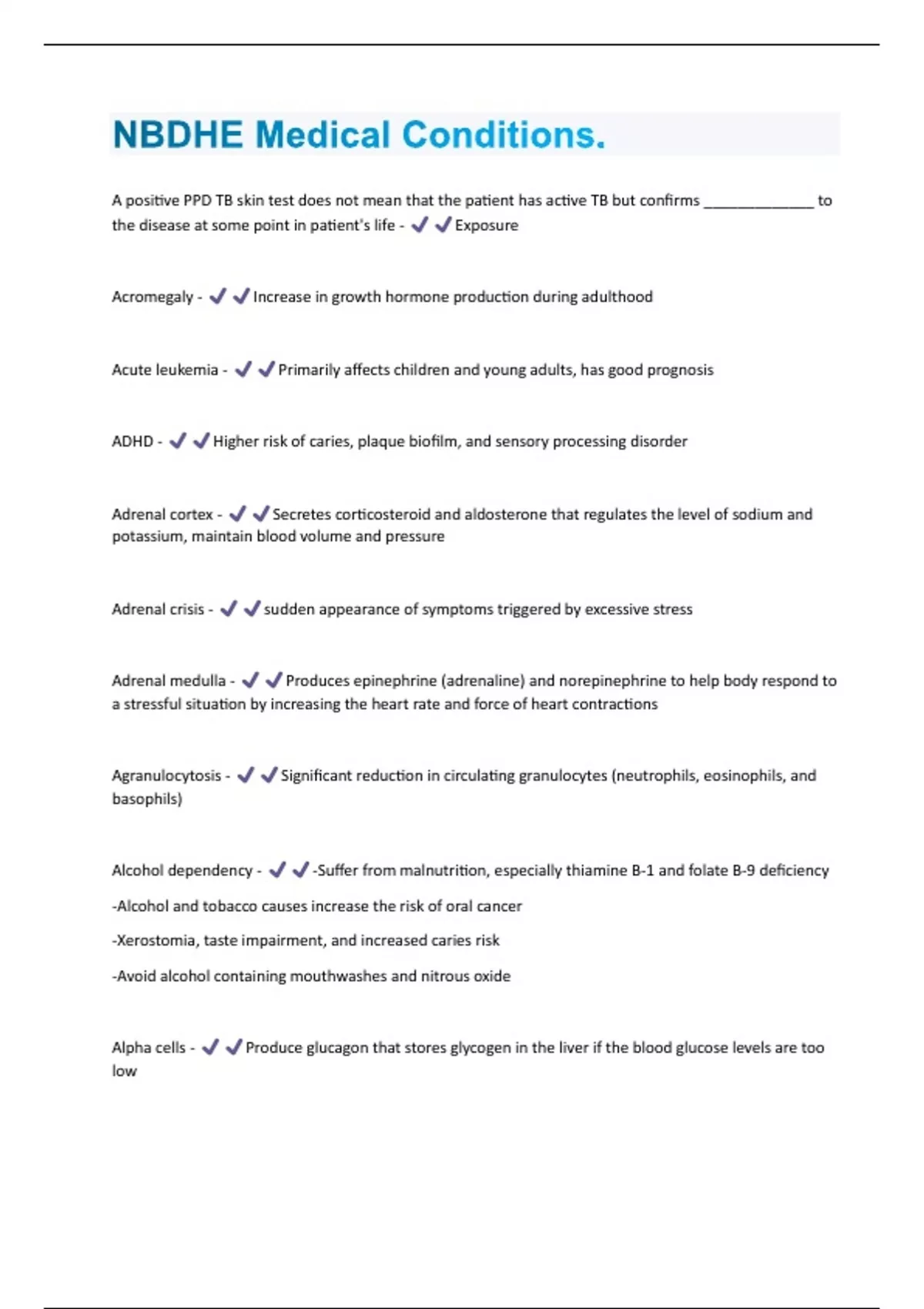 A positive PPD TB skin test does not mean that the patient has active TB but confirms _____________ to the disease at some point in patient's life - Exposure Acromegaly - Increase in growth hormone production during adulthood Acute leukemia - Primarily affects children and young adults, has good prognosis ADHD - Higher risk of caries, plaque biofilm, and sensory processing disorder Adrenal cortex - Secretes corticosteroid and aldosterone that regulates the level of sodium and potassium, maintain blood volume and pressure Adrenal crisis - sudden appearance of symptoms triggered by excessive stress Adrenal medulla - Produces epinephrine (adrenaline) and norepinephrine to help body respond to a stressful situation by increasing the heart rate and force of heart contractions Agranulocytosis - Significant reduction in circulating granulocytes (neutrophils, eosinophils, and basophils) Alcohol dependency - -Suffer from malnutrition, especially thiamine B-1 and folate B-9 deficiency -Alcohol and tobacco causes increase the risk of oral cancer -Xerostomia, taste impairment, and increased caries risk -Avoid alcohol containing mouthwashes and nitrous oxide Alpha cells - Produce glucagon that stores glycogen in the liver if the blood glucose levels are too lowALS (Amyotrophic lateral sclerosis) - -Lou Gehrig's disease -Progressive neurodegenerative disease that affects motor neurons from brain to spinal cord -Leads to death -Ages 40-60 -Muscle weakness, twitching, shortness of breath, etc. Alzeheimer's Disease (AD) - -Destroys memory and other mental functions -Most common cause of dementia -Oral conditions: angular cheilitis, glossitis , loss of taste, root caries, and periodontal disease