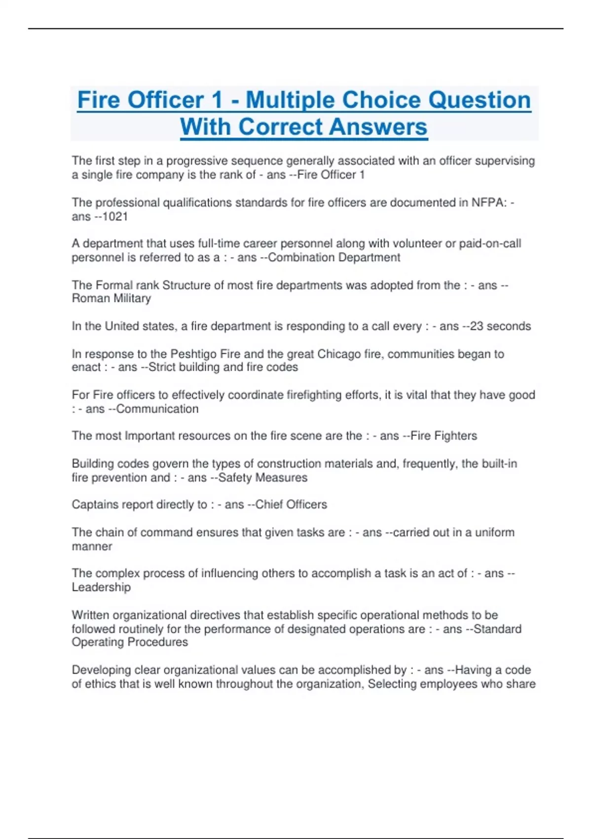 fire officer 1 multiple choice question with cor