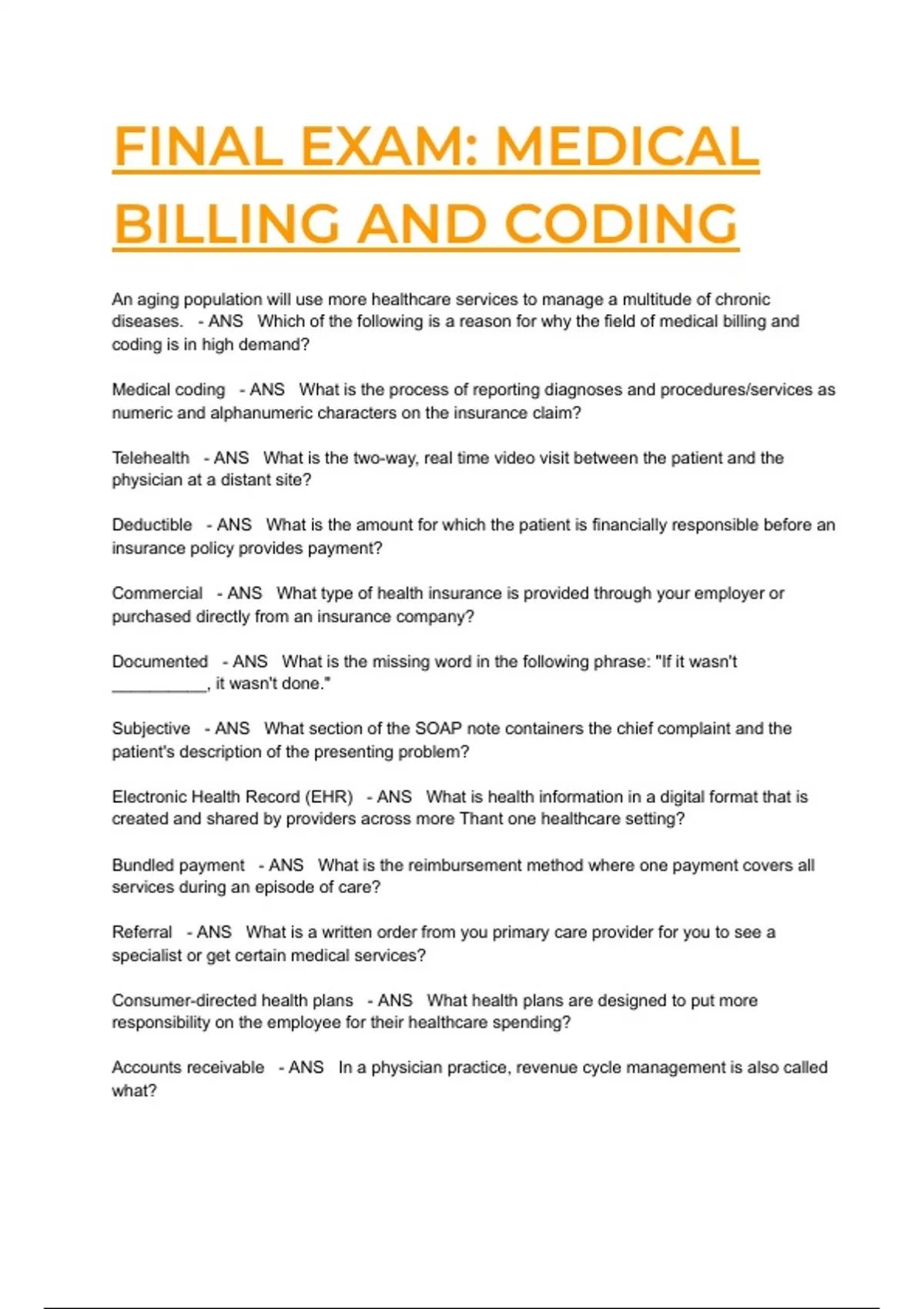 An aging population will use more healthcare services to manage a multitude of chronic diseases. - ANS Which of the following is a reason for why the field of medical billing and coding is in high demand? Medical coding - ANS What is the process of reporting diagnoses and procedures/services as numeric and alphanumeric characters on the insurance claim? Telehealth - ANS What is the two-way, real time video visit between the patient and the physician at a distant site? Deductible - ANS What is the amount for which the patient is financially responsible before an insurance policy provides payment? Commercial - ANS What type of health insurance is provided through your employer or purchased directly from an insurance company? Documented - ANS What is the missing word in the following phrase: "If it wasn't __________, it wasn't done." Subjective - ANS What section of the SOAP note containers the chief complaint and the patient's description of the presenting problem? Electronic Health Record (EHR) - ANS What is health information in a digital format that is created and shared by providers across more Thant one healthcare setting? Bundled payment - ANS What is the reimbursement method where one payment covers all services during an episode of care? Referral - ANS What is a written order from you primary care provider for you to see a specialist or get certain medical services? Consumer-directed health plans - ANS What health plans are designed to put more responsibility on the employee for their healthcare spending? Accounts receivable - ANS In a physician practice, revenue cycle management is also called what? Electronic Data Interchange (EDI) - ANS What is the computer to computer transfer of data between providers and third-party payers? Rejected claim - ANS What type of claim was never entered in to the computer system of the insurance company because it failed to meet specific data requirements? Allowable charge - ANS What is the maximum amount that an insurer will reimburse for a covered service or procedure? Patients are informed about what charges to expect. - ANS What is the price transparency in healthcare? Emancipated minor - ANS What is the term for an individual who has not reached the age of majority (usually 18) but is no longer under the care and control of parents? Protected Health Information (PHI) - ANS What is any information that can link a specific individual to medical records? The patient allows insurance benefits to be paid directly to the provider. - ANS Which of the following is an example of consent? Electronic - ANS The HIPAA security rule provides standards for health information maintained or transmitted in what format? Falsifying patient records to justify the medical necessity of services. - ANS Which of the following is an example of fraud? Original records should never be released. - ANS Which of the following s true concerning the release of patient information? Neoplasm - ANS What is the main term for primary pancreatic neoplasm of the head of the pancreas? October 1 - ANS ICD coding changes, additions and deletions are effective on what date every year? R07.89 - ANS The patient was evaluated in the emergency room for anterior chest wall pain, suspect unstable angina. What is the ICD-10-CM code? I12.0, N18.5 - ANS The patient was seen in follow up for hypertension and chronic kidney disease, stage 5. What is the ICD-10-CM code? Z01.810 - ANS The patient was seen for pre-operative cardiovascular examination undergoing cholecystectomy. What is the correct ICD-10-CM code? M41.23 - ANS The patient's diagnosis is idiopathic scoliosis of the cervicothoracic region. What is the correct ICD-10-CM code? Surgery - ANS In which main section of the CPT codebook would you find the code for a cholecystectomy? 11200, 11201 - ANS The patient requested removal of 20 skin tags. What is the CPT code? 64719-LT - ANS The hand surgeon performed a neuroplasty of the ulnar nerve of the left wrist. What is the CPT code? 58 - ANS The surgeon performed debridement of an open leg wound. Two days later the surgeon performed a more extensive debridement of the same wound. What modifier is reported with the second service? 77080-26 - ANS The patient with a history of osteopenia was referred for a DXA scan of the axial skeleton. What is the correct CPT code, professional component only? 97035 - ANS The patient was seen in the outpatient physical therapy department for 15 minutes of ultrasound therapy for bursitis of the hip. What is the correct CPT code? 99283 - ANS A visit in the E/M involved an expanded problem focused history and physical exam with decision making of moderate complexity. What is the correct CPT code? Codes for reporting procedures, services, medical equipment, and supplies not included in CPT. - ANS What does the HCPCS level II coding classification system provide to medical providers and suppliers? J2270 - ANS Using the table of drugs and biological in the HCPCS level II codebook, what is the code for a 10 mg injection of morphine sulfate? E0561 - ANS The durable medical equipment dealer supplied the patient with a non heated humidifier to be used with his CPAP device. What is the correct HCPCS level II code? A4500 - ANS Following surgery the patient was provided with below knee length surgical stockings. What is the correct HCPCS level II code? AS - ANS What is the correct level II modifier used for a PA's role to assist a surgeon during a procedure? Intravenous - ANS What is the fastest but also most dangerous route of drug administration? Generic - ANS What is a chemically equivalent lower cost version of a brand name drug? Medication list - ANS Where are the names, dosages, and all reasons for all drugs that patient currently takes documented in a medical record? Physician query - ANS What is a written request to a physician to clarify or complete the information in clinical documentation to ensure accurate health records? Laboratory report - ANS A test that scre