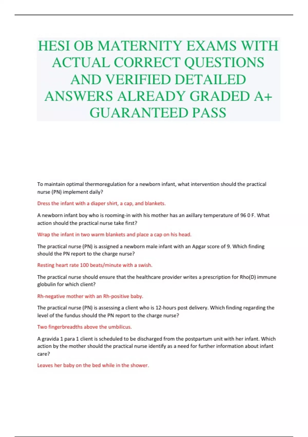 HESI OB MATERNITY EXAMS WITH ACTUAL CORRECT QUESTIONS AND VERIFIED DETAILED ANSWERS ALREADY GRADED A+ GUARANTEED PASS