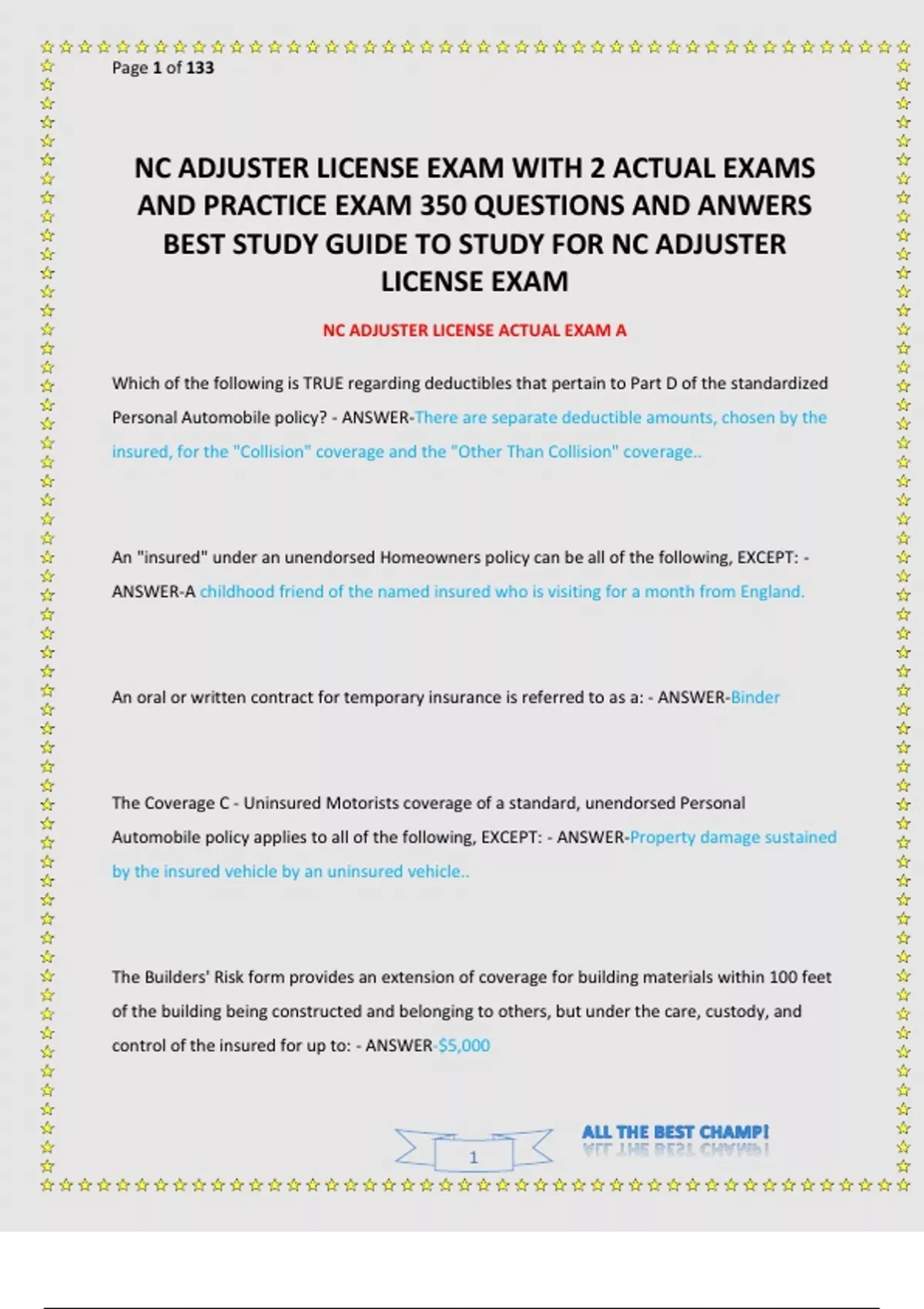 NC ADJUSTER LICENSE EXAM WITH 2 ACTUAL EXAMS AND PRACTICE EXAM 350 QUESTIONS AND ANWERS BEST STUDY GUIDE TO STUDY FOR NC ADJUSTER LICENSE EXAM.
