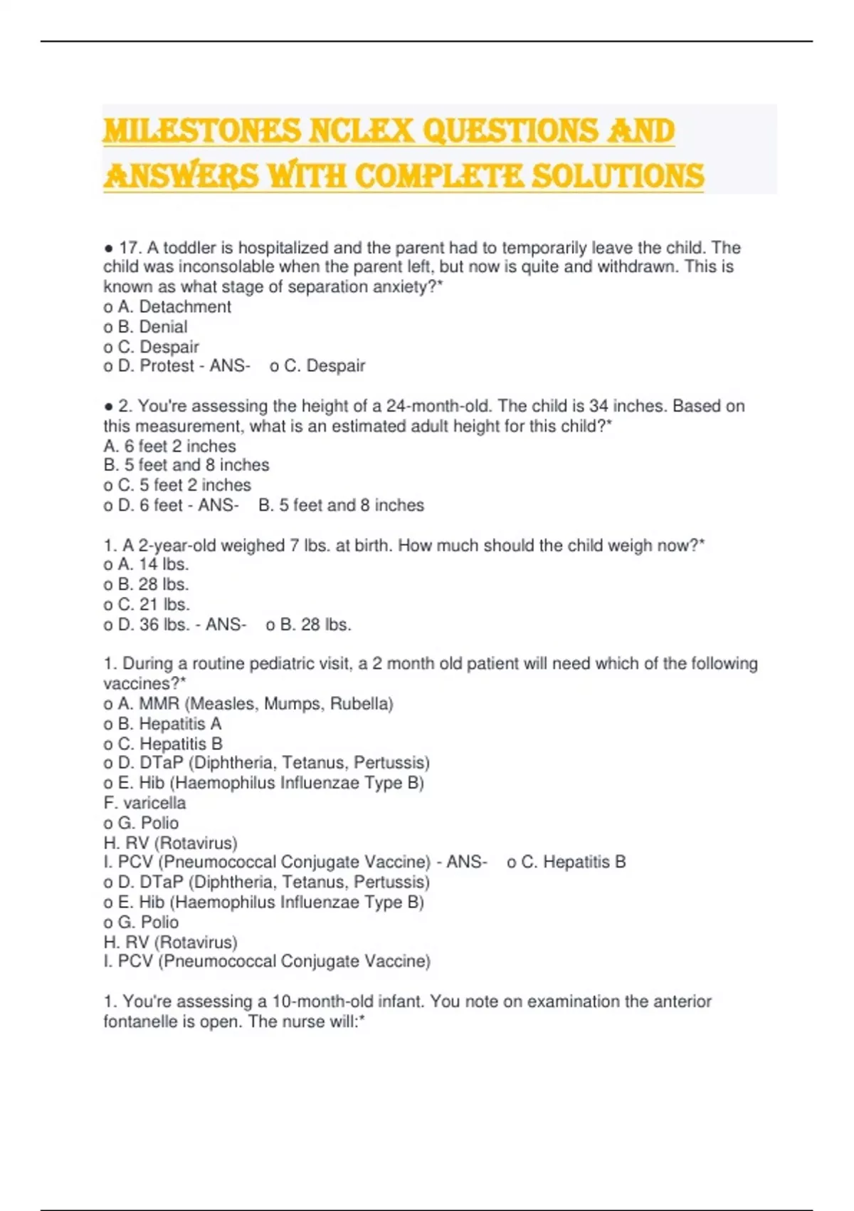 Milestones NCLEX questions and Answers with complete solutions ● 17. A toddler is hospitalized and the parent had to temporarily leave the child. The child was inconsolable when the parent left, but now is quite and withdrawn. This is known as what stage of separation anxiety?* o A. Detachment o B. Denial o C. Despair o D. Protest - ANS- o C. Despair ● 2. You're assessing the height of a 24-month-old. The child is 34 inches. Based on this measurement, what is an estimated adult height for this child?* A. 6 feet 2 inches B. 5 feet and 8 inches o C. 5 feet 2 inches o D. 6 feet - ANS- B. 5 feet and 8 inches 1. A 2-year-old weighed 7 lbs. at birth. How much should the child weigh now?* o A. 14 lbs. o B. 28 lbs. o C. 21 lbs. o D. 36 lbs. - ANS- o B. 28 lbs. 1. During a routine pediatric visit, a 2 month old patient will need which of the following vaccines?* o A. MMR (Measles, Mumps, Rubella) o B. Hepatitis A o C. Hepatitis B o D. DTaP (Diphtheria, Tetanus, Pertussis) o E. Hib (Haemophilus Influenzae Type B) F. varicella o G. Polio H. RV (Rotavirus) I. PCV (Pneumococcal Conjugate Vaccine) - ANS- o C. Hepatitis B o D. DTaP (Diphtheria, Tetanus, Pertussis) o E. Hib (Haemophilus Influenzae Type B) o G. Polio H. RV (Rotavirus) I. PCV (Pneumococcal Conjugate Vaccine) 1. You're assessing a 10-month-old infant. You note on examination the anterior fontanelle is open. The nurse will:* o A. Document this as an abnormal finding because this fontanelle should close at 2 months o B. Document this as a normal finding because this fontanelle closes at about 18 months o C. Document this as a normal finding because this fontanelle closes at about 12 months o D. Document this as an abnormal finding because this fontanelle should close at 6 months - ANS- B. Document this as a normal finding because this fontanelle closes at about 18 months 10. According to Piaget's Theory of Development, your patient is in the Preoperational Stage based on their age. The patient demonstrates they are in this stage by which finding below?* o A. The child understands time and quantity. o B. The child likes to play pretend. o C. This concept of object permanence is not developed yet. o D. The child possesses abstract thinking rather than concrete thinking. - ANS- o B. The child likes to play pretend. 10. You're developing a plan of care for an infant and you include activities for play. The play activities include hiding a toy and letting the infant look for it along with playing peek-a-boo. Which infant below would best benefit from this type of play?* o A. 6-month-old o B. 2-month-old o C. 9-month-old o D. 4-month-old - ANS- o C. 9-month-old 11. A 12-month-old arrives to the health clinic for a well visit. You're assessing the infant's developmental milestones. Select below all the milestones the child should be able to perform?* A. Rides a tricycle B. Draws a triangle o C. Pulls to a standing position and can take a few steps o D. Follows simple commands like "wave bye-bye" o E. Puts objects in a container o F. Hits two small wooden blocks together G. says 2-3 word sentences - ANS- o C. Pulls to a standing position and can take a few steps o D. Follows simple commands like "wave bye-bye" o E. Puts objects in a container o F. Hits two small wooden blocks together 11. You're creating a plan of care for a 24-month-old and developing interventions to help with the development of the child. According to Erickson's Stages of Development, what intervention below would help promote development in this patient?* o A. Thoroughly communicate the rules to the child. o B. Encourage the child to ask questions about care. o C. Take time to swaddle and rock the child when crying. o D. Give the child opportunities to make food and drink selections. - ANS- o D. Give the child opportunities to make food and drink selections. 12. A 20-month-old is in what stage of development according to Erickson's Stages of Development?* o A. Industry vs. Inferiority o B. Initiative vs. Guilt o C. Autonomy vs. Shame and Guilt o D. Trust vs. Mistrust - ANS- o C. Autonomy vs. Shame and Guilt 12. Your patient is 5-months-old. Which developmental milestone, if not performed by the infant, should be further investigated?* o A. Crawling oB. Rolling over from back to tummy o C. Using the pincer grasp o D. Sitting without support - ANS- oB. Rolling over from back to tummy 13. You observe toddlers playing. The children are playing with toys, but they are not playing together. This type of play is known as?* o A. Solitary play o B. Parallel play o C. Associate play o D. Co-operative - ANS- o B. Parallel play 13. You're teaching a new mom of a 1-week-old infant on how to prevent SIDS (Sudden Infant Death Syndrome). Which statement by the parent requires you to re-educate the parent on this topic?* o A. "The best sleeping position for the baby is on their side or tummy". o B. "It's okay to share the same room with the baby." o C. "I will stop swaddling the baby once he can roll over onto his tummy". o D. "I will be sure to remove extra blankets and toys from the baby's bed." - ANS- o A. "The best sleeping position for the baby is on their side or tummy". 14. You're helping develop a meal plan for a 10-month-old. Which foods will you select to be part of the meal plan? Select all that apply:* o A. Mashed potatoes o B. Grapes o C. Soup o D. Toast with honey - ANS- o A. Mashed potatoes o C. Soup 14. You're providing caring to a 2-year-old and have noted negativism. Which statement by the nurse to the toddler will help decrease negativism when administering medications to the toddler?* o A. "Are you ready for your medicine?" o B. "Can you take your medicine in a cup?" o C. "Do you want to take your medicine now?" oD. "You can take your medicine in the blue or green cup." - ANS- oD. "You can take your medicine in the blue or green cup." 15. The nurse is educating the parents of a 13-month-old on how to avoid dental caries. Which statements should the nurse include in the ed
