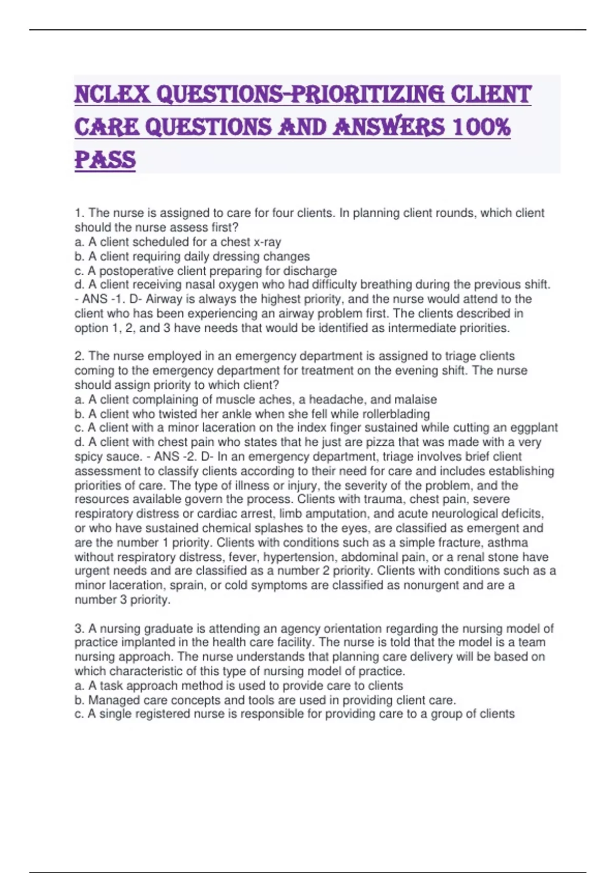 NCLEX Questions-Prioritizing Client Care Questions and Answers 100% pass