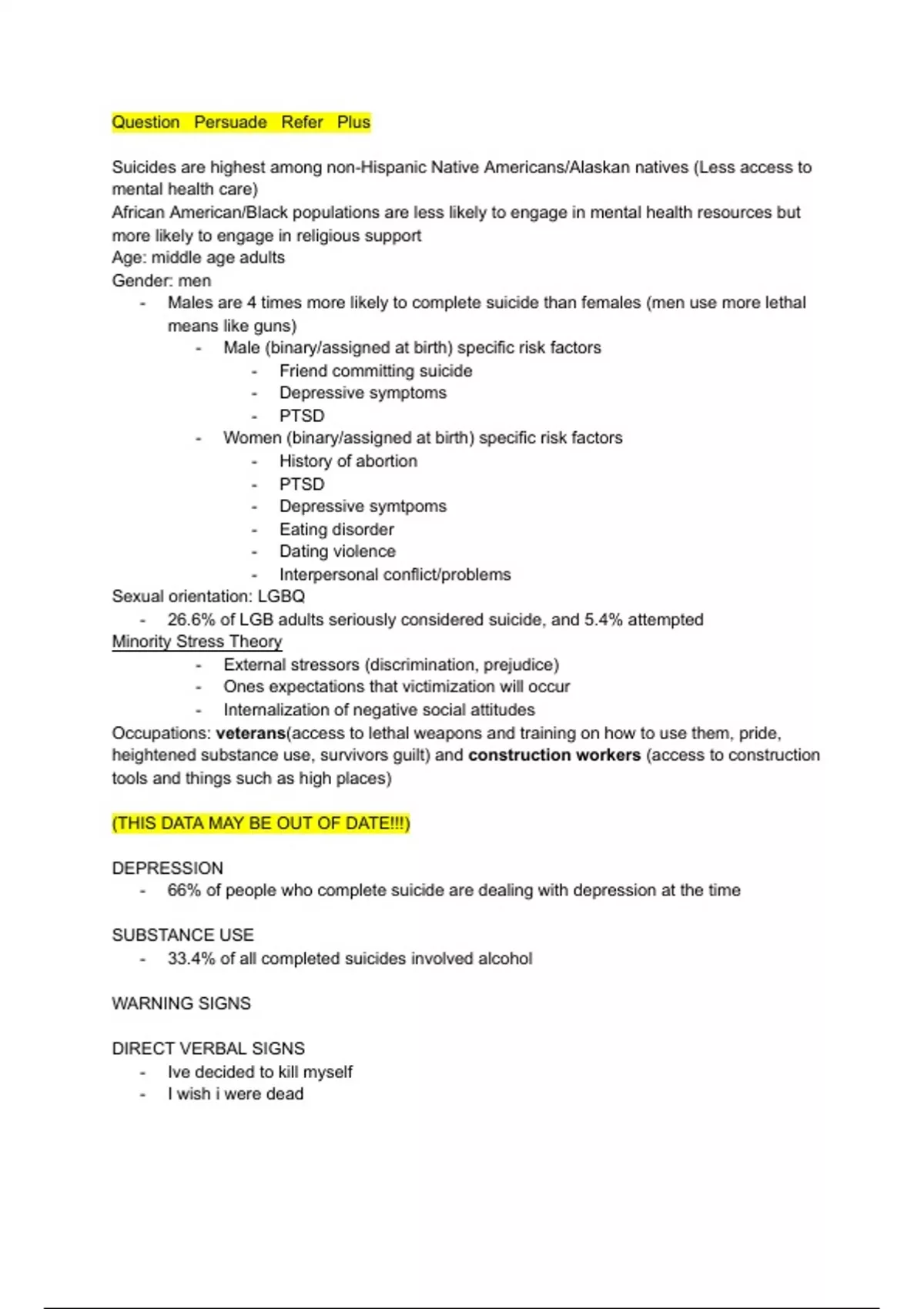 In-depth notes about how to employ the Question, Persuade, Refer strategy to prevent suicide as well as how to recognize the warning signs of suicide and mental health struggles