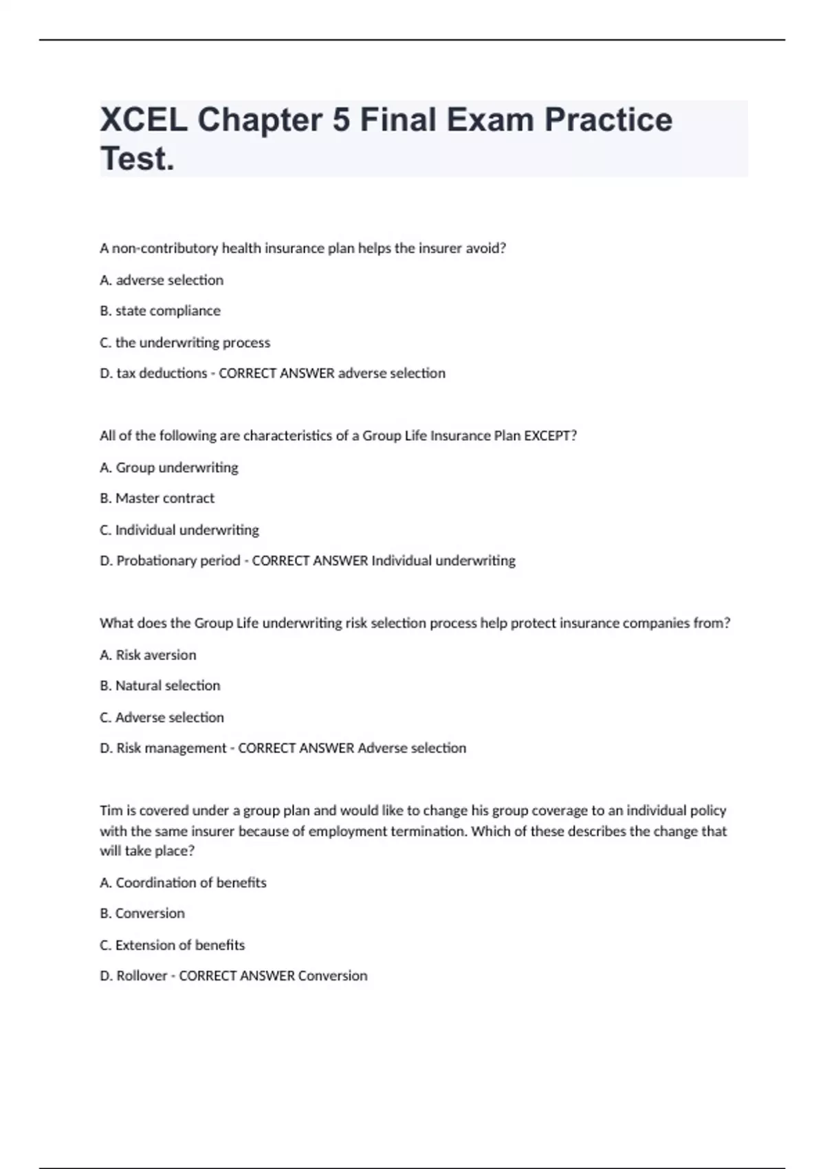 All of the following are characteristics of a Group Life Insurance Plan EXCEPT? A. Group underwriting
