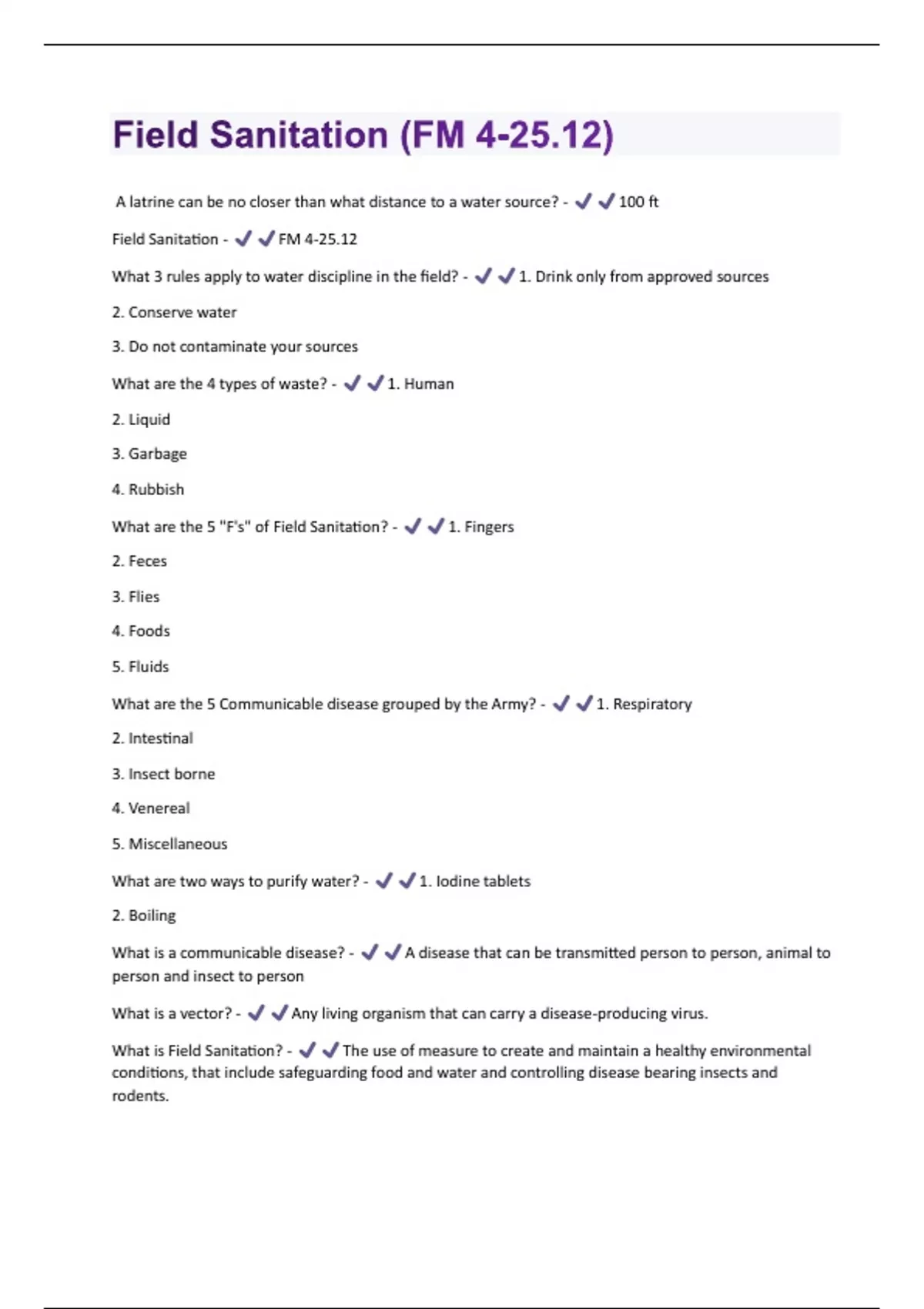 A latrine can be no closer than what distance to a water source? - 100 ft Field Sanitation - FM 4-25.12 What 3 rules apply to water discipline in the field? - 1. Drink only from approved sources 2. Conserve water 3. Do not contaminate your sources What are the 4 types of waste? - 1. Human 2. Liquid 3. Garbage 4. Rubbish What are the 5 "F's" of Field Sanitation? - 1. Fingers 2. Feces 3. Flies 4. Foods 5. Fluids What are the 5 Communicable disease grouped by the Army? - 1. Respiratory 2. Intestinal 3. Insect borne 4. Venereal 5. Miscellaneous What are two ways to purify water? - 1. Iodine tablets 2. Boiling What is a communicable disease? - A disease that can be transmitted person to person, animal to person and insect to person What is a vector? - Any living organism that can carry a disease-producing virus. What is Field Sanitation? - The use of measure to create and maintain a healthy environmental conditions, that include safeguarding food and water and controlling disease bearing insects and rodents.What is potable water - Water that is safe to drink What is the best protection against disease or biological warfare? - Immunization and personal hygiene What is the water requirements per person, per day in a temperate zone? - 5 gallons Who gives the final approval on whether water is safe to drink? - Medical Personnel