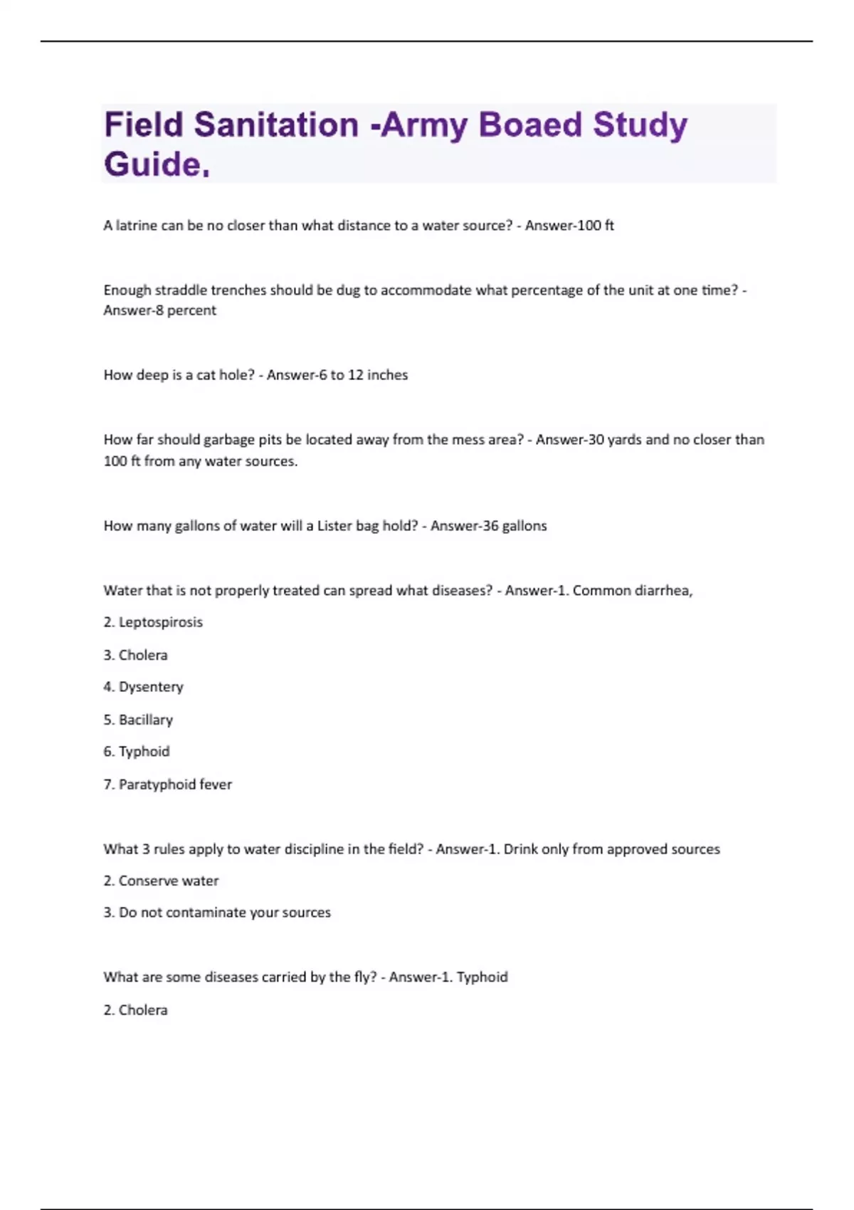 Field Sanitation -Army Boaed Study Guide Questions And Answers With Latest Quiz