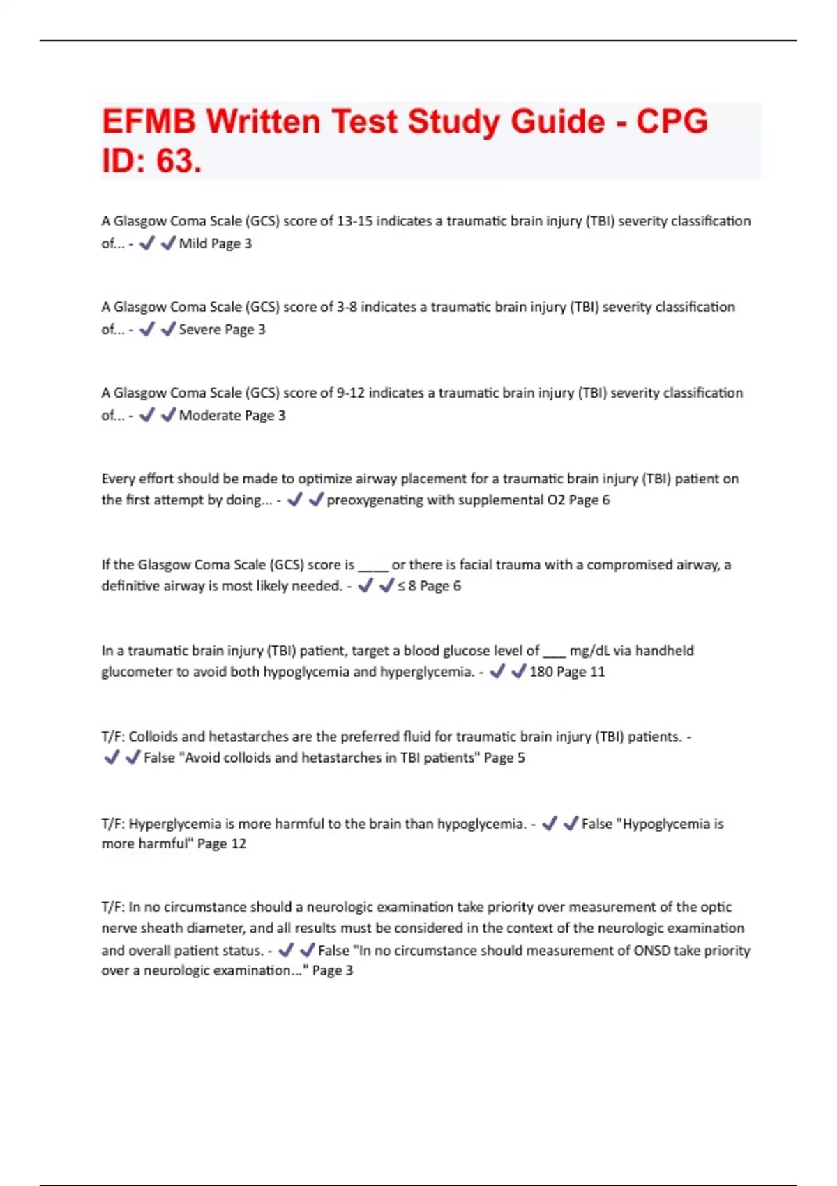 A Glasgow Coma Scale (GCS) score of 13-15 indicates a traumatic brain injury (TBI) severity classification of... - Mild Page 3 A Glasgow Coma Scale (GCS) score of 3-8 indicates a traumatic brain injury (TBI) severity classification of... - Severe Page 3 A Glasgow Coma Scale (GCS) score of 9-12 indicates a traumatic brain injury (TBI) severity classification of... - Moderate Page 3 Every effort should be made to optimize airway placement for a traumatic brain injury (TBI) patient on the first attempt by doing... - preoxygenating with supplemental O2 Page 6 If the Glasgow Coma Scale (GCS) score is ____ or there is facial trauma with a compromised airway, a definitive airway is most likely needed. - ≤ 8 Page 6 In a traumatic brain injury (TBI) patient, target a blood glucose level of ___ mg/dL via handheld glucometer to avoid both hypoglycemia and hyperglycemia. - 180 Page 11 T/F: Colloids and hetastarches are the preferred fluid for traumatic brain injury (TBI) patients. - False "Avoid colloids and hetastarches in TBI patients" Page 5 T/F: Hyperglycemia is more harmful to the brain than hypoglycemia. - False "Hypoglycemia is more harmful" Page 12 T/F: In no circumstance should a neurologic examination take priority over measurement of the optic nerve sheath diameter, and all results must be considered in the context of the neurologic examination and overall patient status. - False "In no circumstance should measurement of ONSD take priority over a neurologic examination..." Page 3T/F: Neuromuscular blocking agents will mask seizures and clinical examination changes in traumatic brain injury (TBI) patients. - True. Page 12 T/F: Patients typically require less sedation after cricothyroidotomy than after endotracheal tube (ETT) placement. - True. Page 6 T/F: Visualizations of spontaneous venous pulsations with an opthalmoscope can reassure the provider that intracranial pressure (ICP) is not critically elevated. - True. Page 4