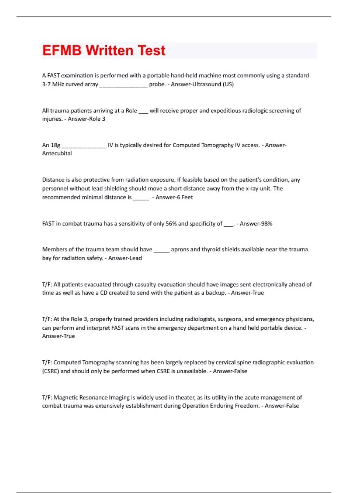 A FAST examination is performed with a portable hand-held machine most commonly using a standard 3-7 MHz curved array _______________ probe. - Answer-Ultrasound (US) All trauma patients arriving at a Role ___ will receive proper and expeditious radiologic screening of injuries. - Answer-Role 3 An 18g ______________ IV is typically desired for Computed Tomography IV access. - AnswerAntecubital Distance is also protective from radiation exposure. If feasible based on the patient's condition, any personnel without lead shielding should move a short distance away from the x-ray unit. The recommended minimal distance is _____. - Answer-6 Feet FAST in combat trauma has a sensitivity of only 56% and specificity of ___. - Answer-98% Members of the trauma team should have _____ aprons and thyroid shields available near the trauma bay for radiation safety. - Answer-Lead T/F: All patients evacuated through casualty evacuation should have images sent electronically ahead of time as well as have a CD created to send with the patient as a backup. - Answer-True T/F: At the Role 3, properly trained providers including radiologists, surgeons, and emergency physicians, can perform and interpret FAST scans in the emergency department on a hand held portable device. - Answer-True T/F: Computed Tomography scanning has been largely replaced by cervical spine radiographic evaluation (CSRE) and should only be performed when CSRE is unavailable. - Answer-False T/F: Magnetic Resonance Imaging is widely used in theater, as its utility in the acute management of combat trauma was extensively establishment during Operation Enduring Freedom. - Answer-FalseT/F: The FAST exam remains the most sensitive test for hollow viscus injury and mesenteric injury. - Answer-False T/F: The goal of Computed Tomography contrast injection is to provide concurrent solid organ enhancement, arterial enhancement, and pulmonary arterial. - Answer-True T/F: When performing Computed Tomography scan on a Military Working Dog, utilize a scanning protocol based on the adult settings to include the doses of and rates of contrast administration. - Answer-False The initial radiographic evaluation of a trauma patient begins with supine AnteriorPosterior (AP) chest and pelvis radiographs taken in the trauma bay usually with a(n) _________________. - Answer-Portable X-Ray Machine The standard FAST examination is focused on evaluating for the presence of ______________ in certain areas of the body. - Answer-Free Intraperitoneal Fluid What is the lowest level of care equipped with a Computed Tomography scanner? - Answer-Role 3