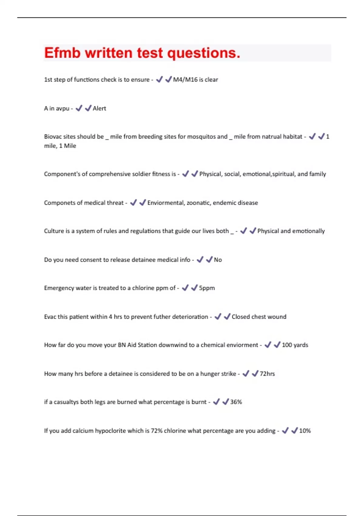 1st step of functions check is to ensure - M4/M16 is clear A in avpu - Alert Biovac sites should be _ mile from breeding sites for mosquitos and _ mile from natrual habitat - 1 mile, 1 Mile Component's of comprehensive soldier fitness is - Physical, social, emotional,spiritual, and family Componets of medical threat - Enviormental, zoonatic, endemic disease Culture is a system of rules and regulations that guide our lives both _ - Physical and emotionally Do you need consent to release detainee medical info - No Emergency water is treated to a chlorine ppm of - 5ppm Evac this patient within 4 hrs to prevent futher deterioration - Closed chest wound How far do you move your BN Aid Station downwind to a chemical enviorment - 100 yards How many hrs before a detainee is considered to be on a hunger strike - 72hrs if a casualtys both legs are burned what percentage is burnt - 36% If you add calcium hypoclorite which is 72% chlorine what percentage are you adding - 10%