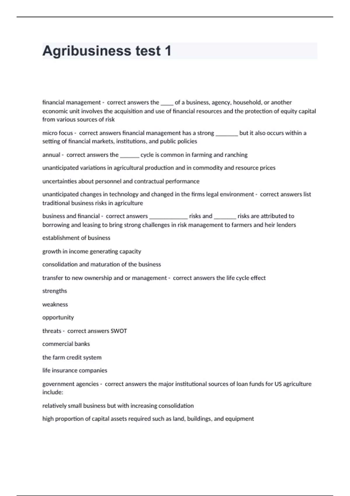 Agribusiness test 1 financial management - correct answers the ____ of a business, agency, household, or another economic unit involves the acquisition and use of financial resources and the protection of equity capital from various sources of risk micro focus - correct answers financial management has a strong _______ but it also occurs within a setting of financial markets, institutions, and public policies annual - correct answers the ______ cycle is common in farming and ranching unanticipated variations in agricultural production and in commodity and resource prices uncertainties about personnel and contractual performance unanticipated changes in technology and changed in the firms legal environment - correct answers list traditional business risks in agriculture business and financial - correct answers ____________ risks and _______ risks are attributed to borrowing and leasing to bring strong challenges in risk management to farmers and heir lenders establishment of business growth in income generating capacity consolidation and maturation of the business transfer to new ownership and or management - correct answers the life cycle effect strengths weakness opportunity threats - correct answers SWOT commercial banks the farm credit system life insurance companies government agencies - correct answers the major institutional sources of loan funds for US agriculture include: relatively small business but with increasing consolidation high proportion of capital assets required such as land, buildings, and equipment