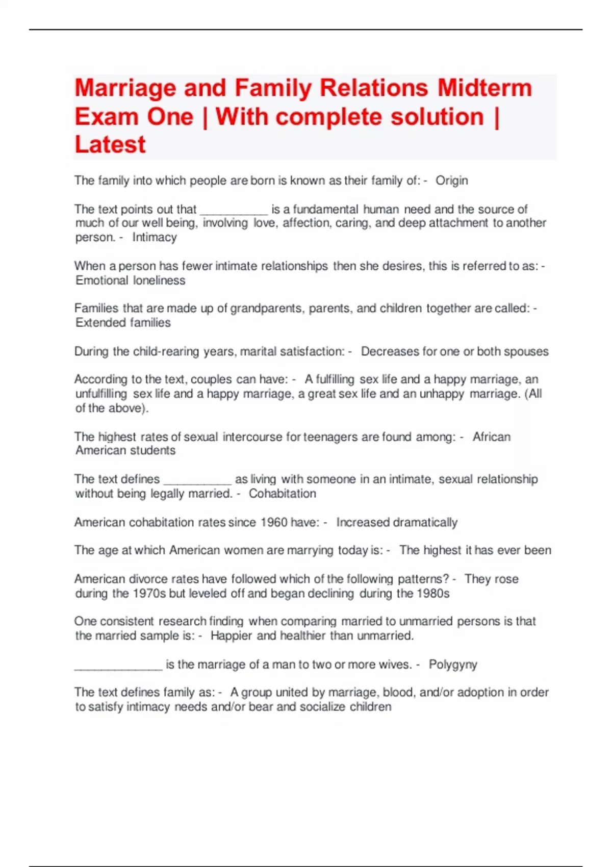 Marriage and Family Relations Midterm Exam One | With complete solution | Latest
