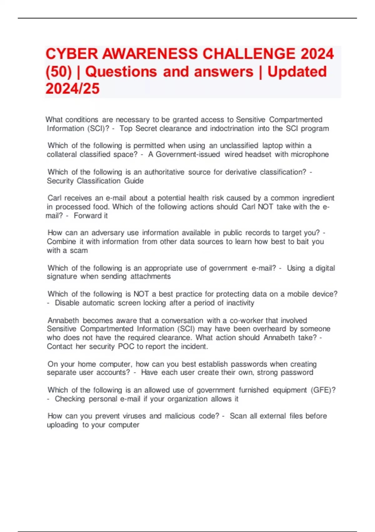CYBER AWARENESS CHALLENGE 2024 (50) | Questions and answers | Updated 2024/25