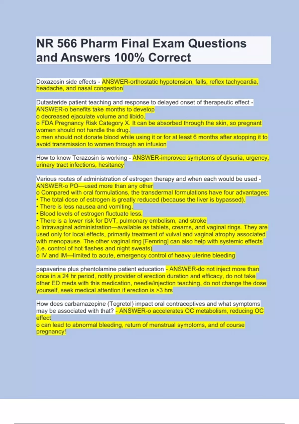 NR 566 Pharm Final Exam Questions and Answers 100% CorrectNR 566 Pharm Final Exam Questions and Answers 100% CorrectNR 566 Pharm Final Exam Questions and Answers 100% CorrectNR 566 Pharm Final Exam Questions and Answers 100% Correct Doxazosin side effects - ANSWER-orthostatic hypotension, falls, reflex tachycardia, headache, and nasal congestion Dutasteride patient teaching and response to delayed onset of therapeutic effect - ANSWER-o benefits take months to develop o decreased ejaculate volume and libido. o FDA Pregnancy Risk Category X. It can be absorbed through the skin, so pregnant women should not handle the drug. o men should not donate blood while using it or for at least 6 months after stopping it to avoid transmission to women through an infusion How to know Terazosin is working - ANSWER-improved symptoms of dysuria, urgency, urinary tract infections, hesitancy