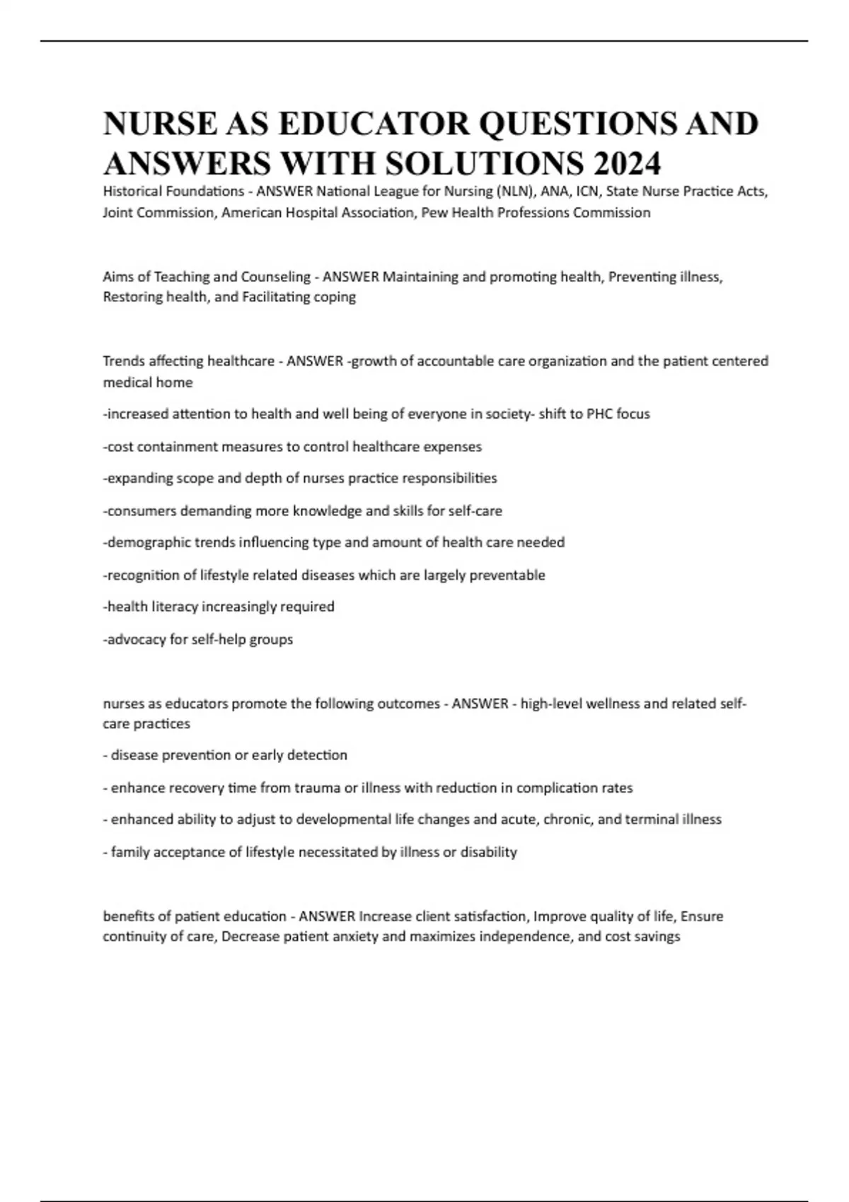 NURSE AS EDUCATOR QUESTIONS AND ANSWERS WITH SOLUTIONS 2024