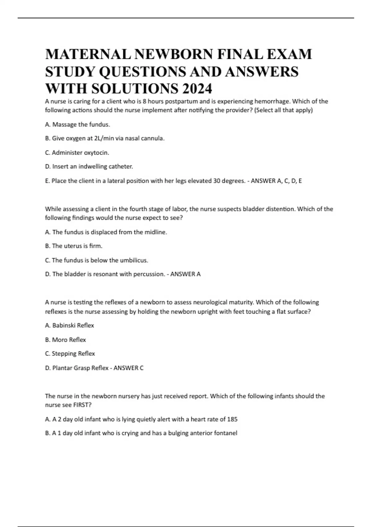 MATERNAL NEWBORN FINAL EXAM STUDY QUESTIONS AND ANSWERS WITH SOLUTIONS 2024