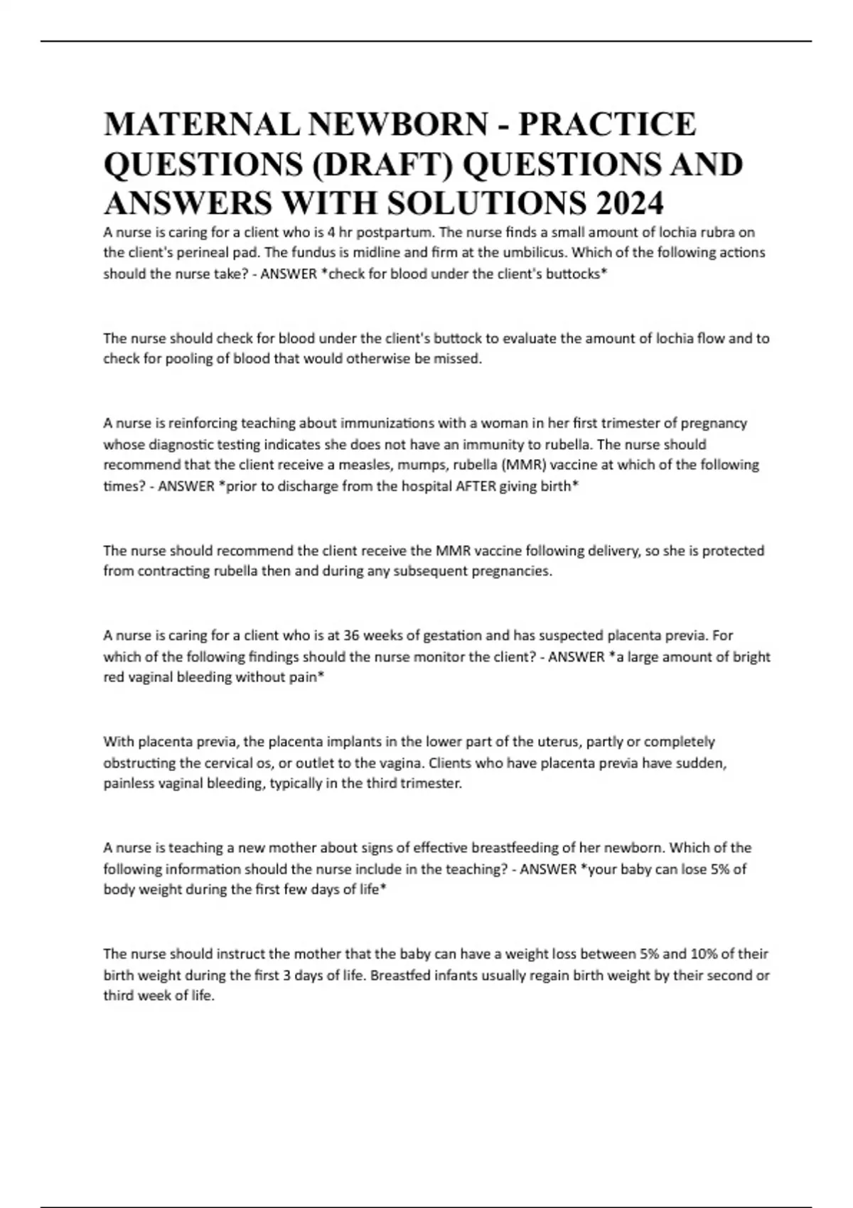 MATERNAL NEWBORN - PRACTICE QUESTIONS (DRAFT) QUESTIONS AND ANSWERS WITH SOLUTIONS 2024