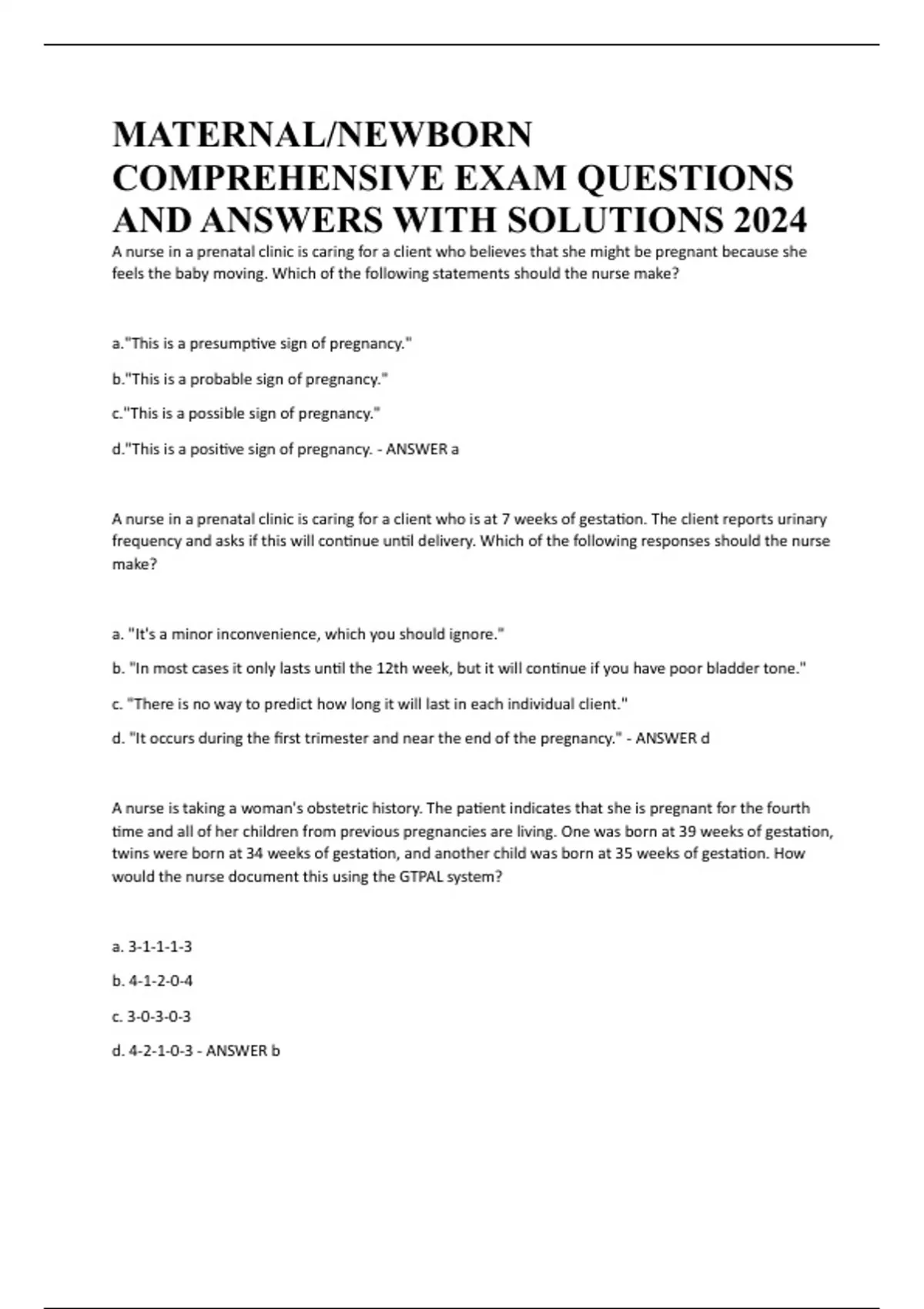 maternalnewborn comprehensive exam questions and
