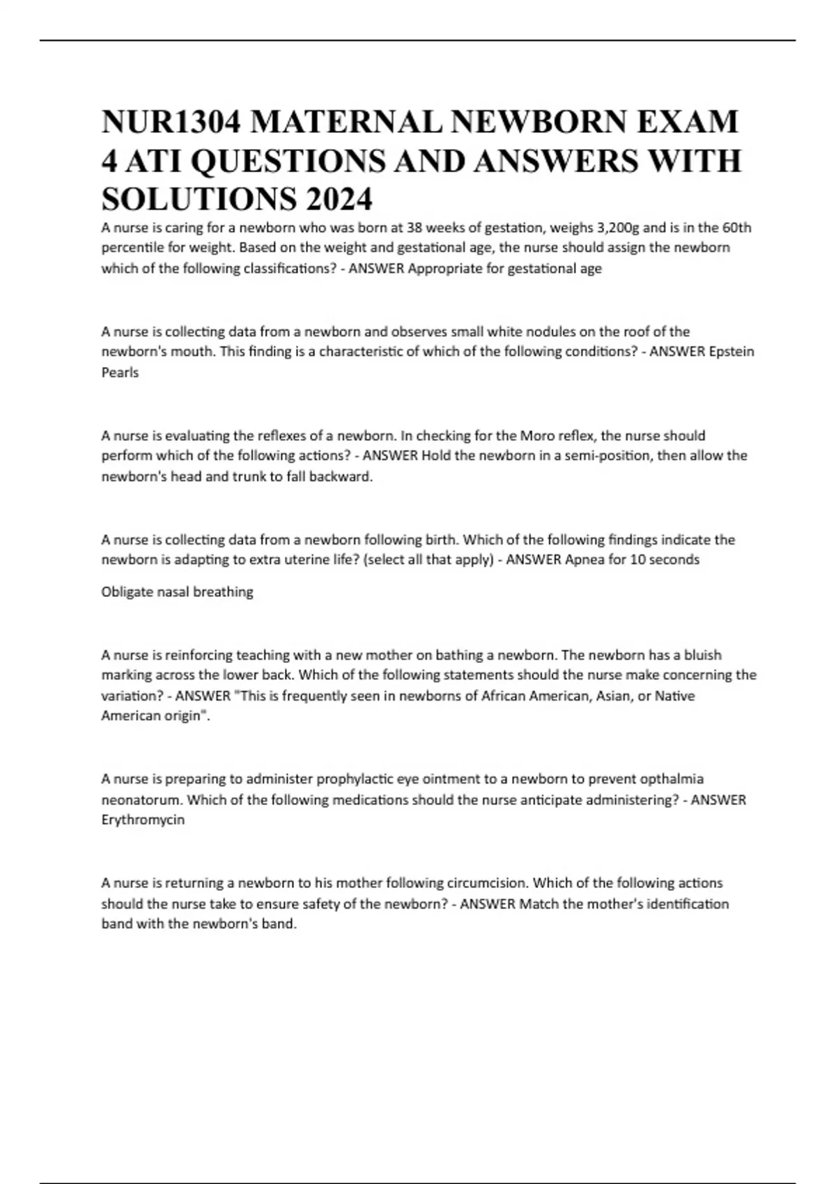 NUR1304 MATERNAL NEWBORN EXAM 4 ATI QUESTIONS AND ANSWERS WITH SOLUTIONS 2024