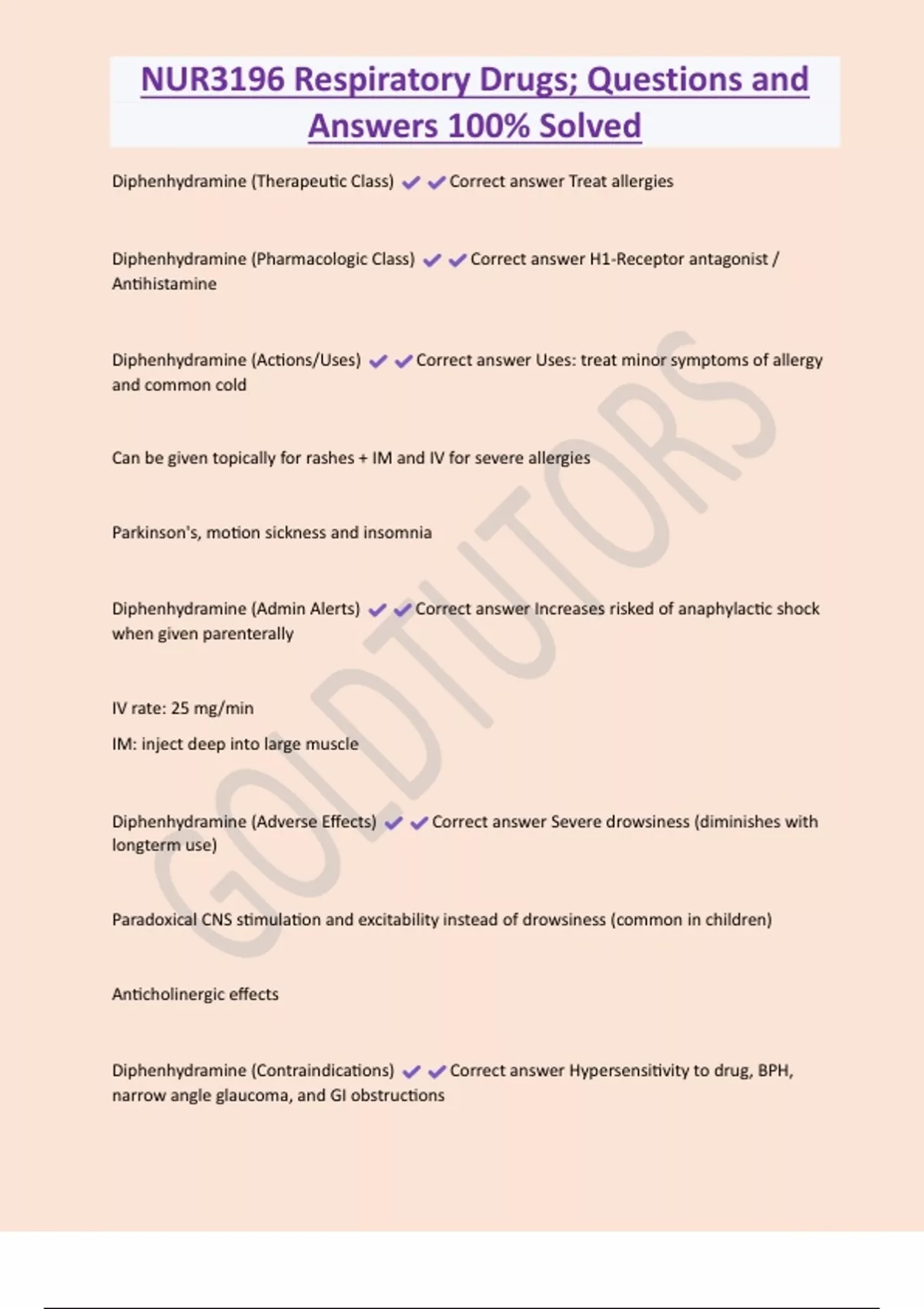 NUR3196 Respiratory Drugs; Questions and Answers 100% Solved Diphenhydramine (Therapeutic Class) Correct answer Treat allergies Diphenhydramine (Pharmacologic Class) Correct answer H1-Receptor antagonist / Antihistamine Diphenhydramine (Actions/Uses) Correct answer Uses: treat minor symptoms of allergy and common cold Can be given topically for rashes + IM and IV for severe allergies Parkinson's, motion sickness and insomnia Diphenhydramine (Admin Alerts) Correct answer Increases risked of anaphylactic shock when given parenterally