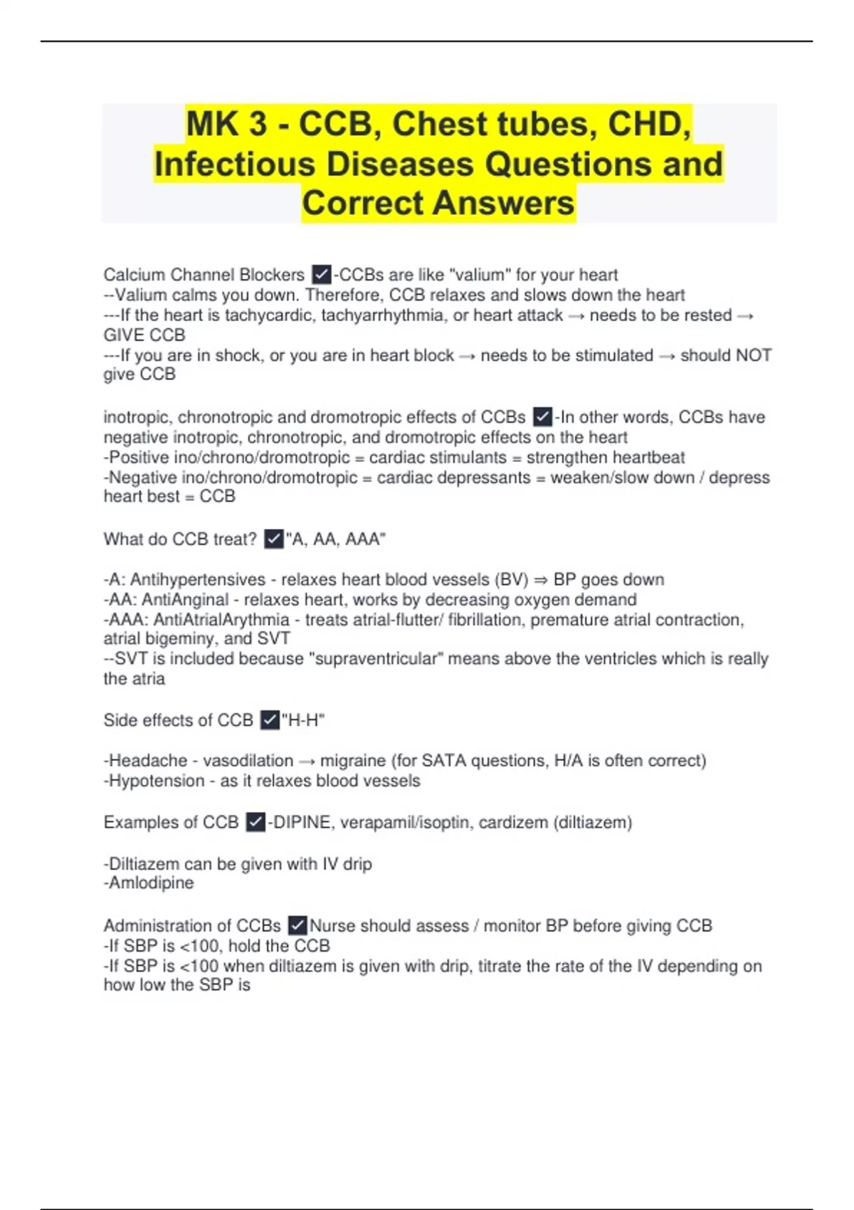 Calcium Channel Blockers -CCBs are like "valium" for your heart --Valium calms you down. Therefore, CCB relaxes and slows down the heart ---If the heart is tachycardic, tachyarrhythmia, or heart attack → needs to be rested → GIVE CCB ---If you are in shock, or you are in heart block → needs to be stimulated → should NOT give CCB inotropic, chronotropic and dromotropic effects of CCBs -In other words, CCBs have negative inotropic, chronotropic, and dromotropic effects on the heart -Positive ino/chrono/dromotropic = cardiac stimulants = strengthen heartbeat -Negative ino/chrono/dromotropic = cardiac depressants = weaken/slow down / depress heart best = CCB What do CCB treat? "A, AA, AAA" -A: Antihypertensives - relaxes heart blood vessels (BV) ⇒ BP goes down -AA: AntiAnginal - relaxes heart, works by decreasing oxygen demand -AAA: AntiAtrialArythmia - treats atrial-flutter/ fibrillation, premature atrial contraction, atrial bigeminy, and SVT --SVT is included because "supraventricular" means above the ventricles which is really the atria Side effects of CCB "H-H" -Headache - vasodilation → migraine (for SATA questions, H/A is often correct) -Hypotension - as it relaxes blood vessels Examples of CCB -DIPINE, verapamil/isoptin, cardizem (diltiazem) -Diltiazem can be given with IV drip -Amlodipine Administration of CCBs Nurse should assess / monitor BP before giving CCB -If SBP is <100, hold the CCB -If SBP is <100 when diltiazem is given with drip, titrate the rate of the IV depending on how low the SBP is