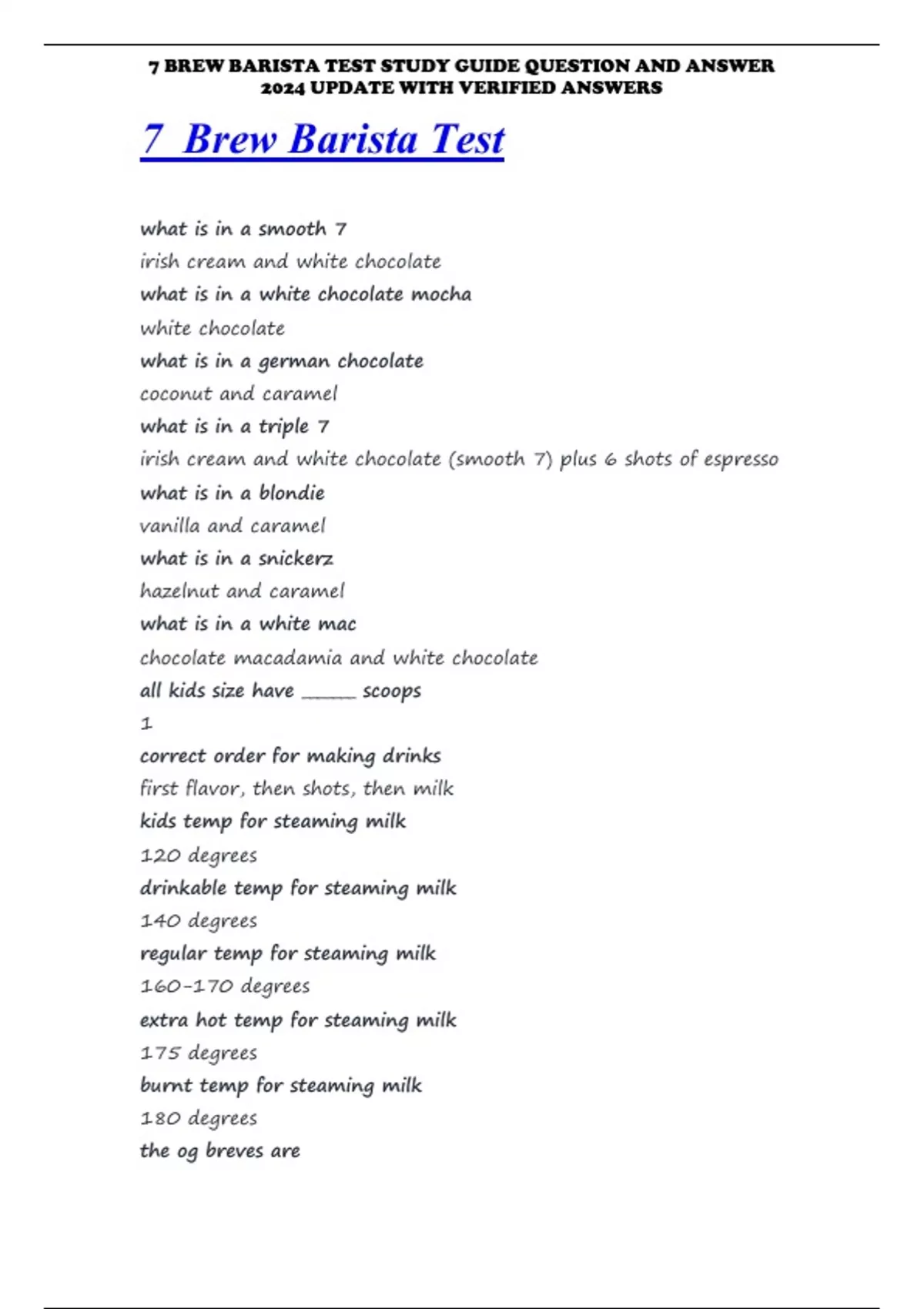 7 BREW BARISTA TEST STUDY GUIDE QUESTION AND ANSWER 2024 UPDATE WITH VERIFIED ANSWERS