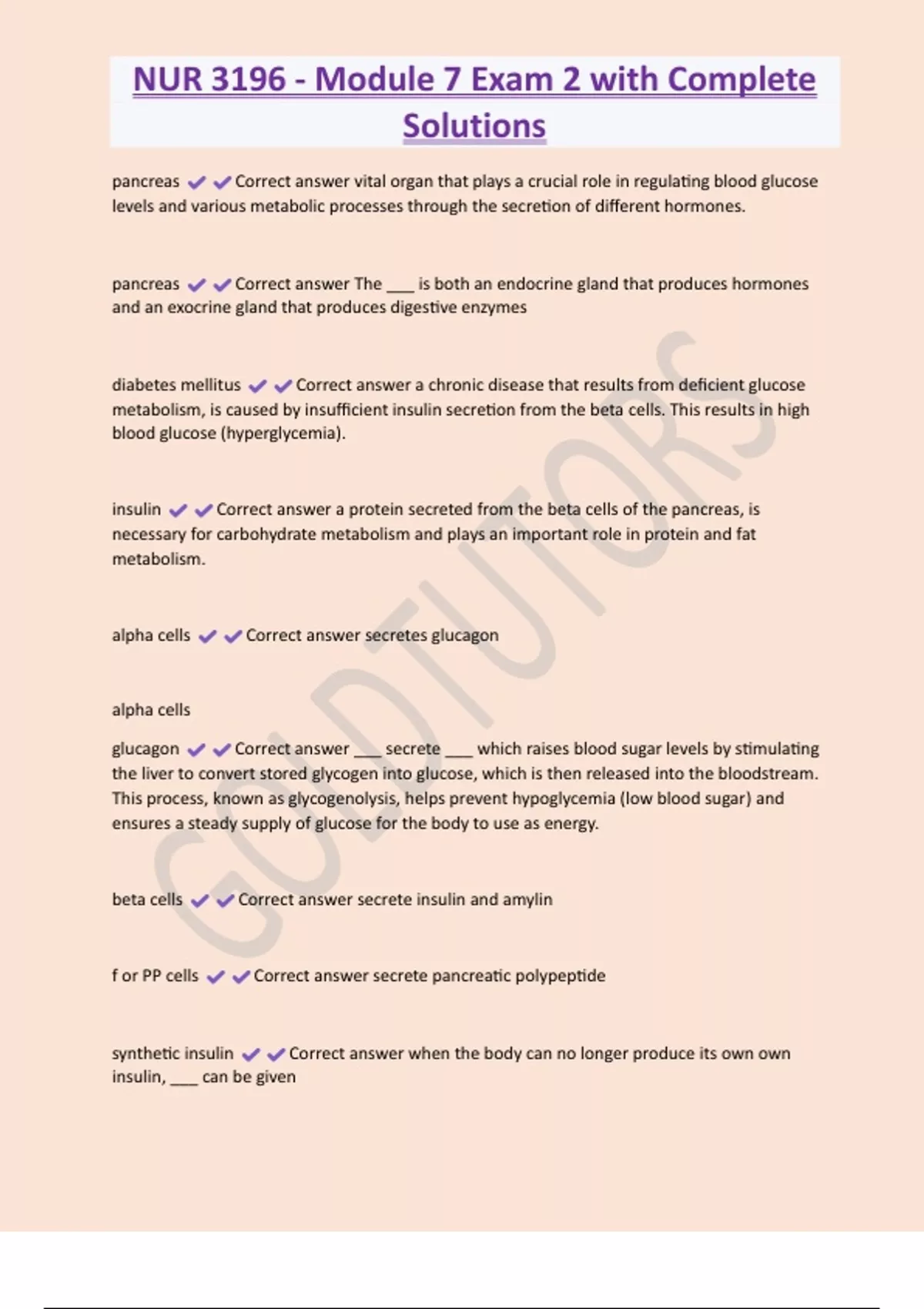 NUR 3196 - Module 7 Exam 2 with Complete Solutions pancreas Correct answer vital organ that plays a crucial role in regulating blood glucose levels and various metabolic processes through the secretion of different hormones. pancreas Correct answer The ___ is both an endocrine gland that produces hormones and an exocrine gland that produces digestive enzymes diabetes mellitus Correct answer a chronic disease that results from deficient glucose metabolism, is caused by insufficient insulin secretion from the beta cells. This results in high blood glucose (hyperglycemia).