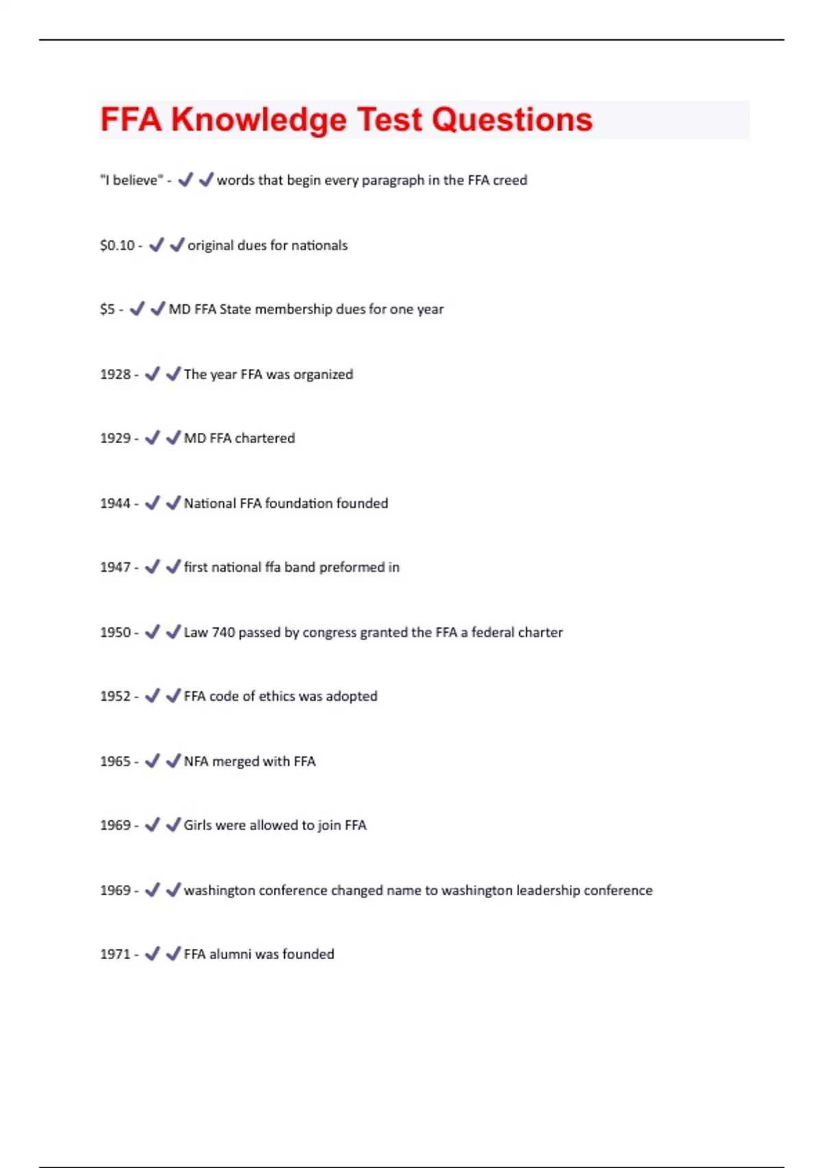 "I believe" - words that begin every paragraph in the FFA creed $0.10 - original dues for nationals $5 - MD FFA State membership dues for one year 1928 - The year FFA was organized 1929 - MD FFA chartered 1944 - National FFA foundation founded 1947 - first national ffa band preformed in 1950 - Law 740 passed by congress granted the FFA a federal charter 1952 - FFA code of ethics was adopted 1965 - NFA merged with FFA 1969 - Girls were allowed to join FFA 1969 - washington conference changed name to washington leadership conference 1971 - FFA alumni was founded1988 - Date FFA changed its name to National FFA organization 2 times at the 38th and 63rd conventions - the FFA creed as been altered twice at _____ 3 years - to receive the american degree a member must have been active for _____ years 33 delegates from 18 states - number of delegates present at the first National FFA convention 45 chapters, 2,300 people - Maryland FFA membership 4th graduation/graduate high school - FFA member can stay, not in the military 5 - number of region maryland has 50% of members are present - Majority