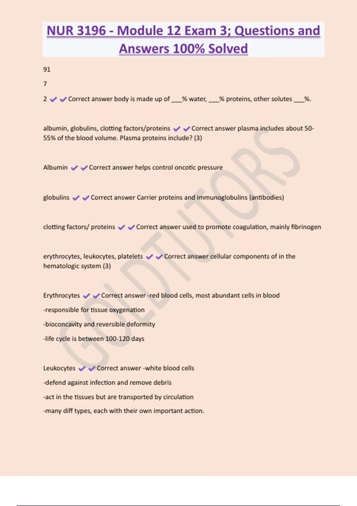 NUR 3196 - Module 12 Exam 3; Questions and Answers 100% Solved 91 7 2 Correct answer body is made up of ___% water, ___% proteins, other solutes ___%. albumin, globulins, clotting factors/proteins Correct answer plasma includes about 50- 55% of the blood volume. Plasma proteins include? (3) Albumin Correct answer helps control oncotic pressure globulins Correct answer Carrier proteins and immunoglobulins (antibodies) clotting factors/ proteins Correct answer used to promote coagulation, mainly fibrinogen erythrocytes, leukocytes, platelets Correct answer cellular components of in the hematologic system (3) Erythrocytes Correct answer -red blood cells, most abundant cells in blood