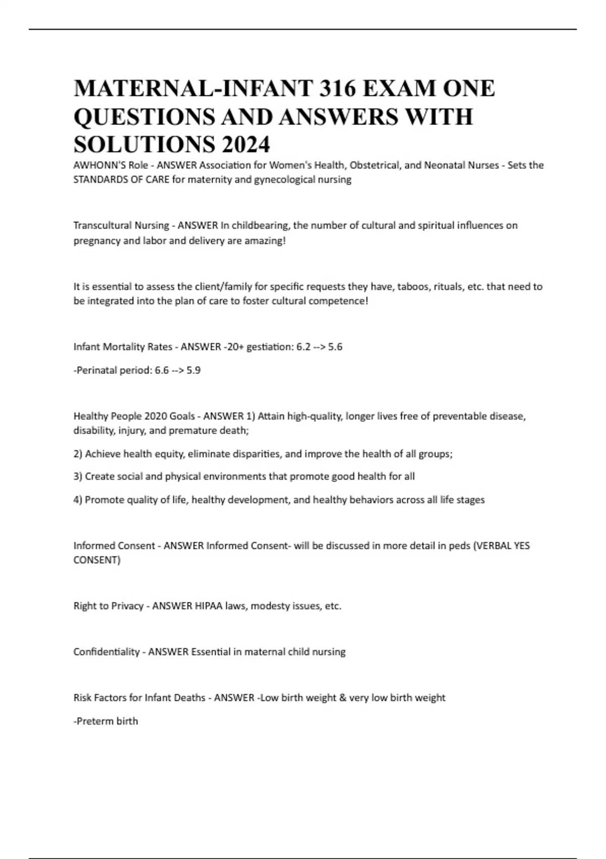 MATERNAL-INFANT 316 EXAM ONE QUESTIONS AND ANSWERS WITH SOLUTIONS 2024