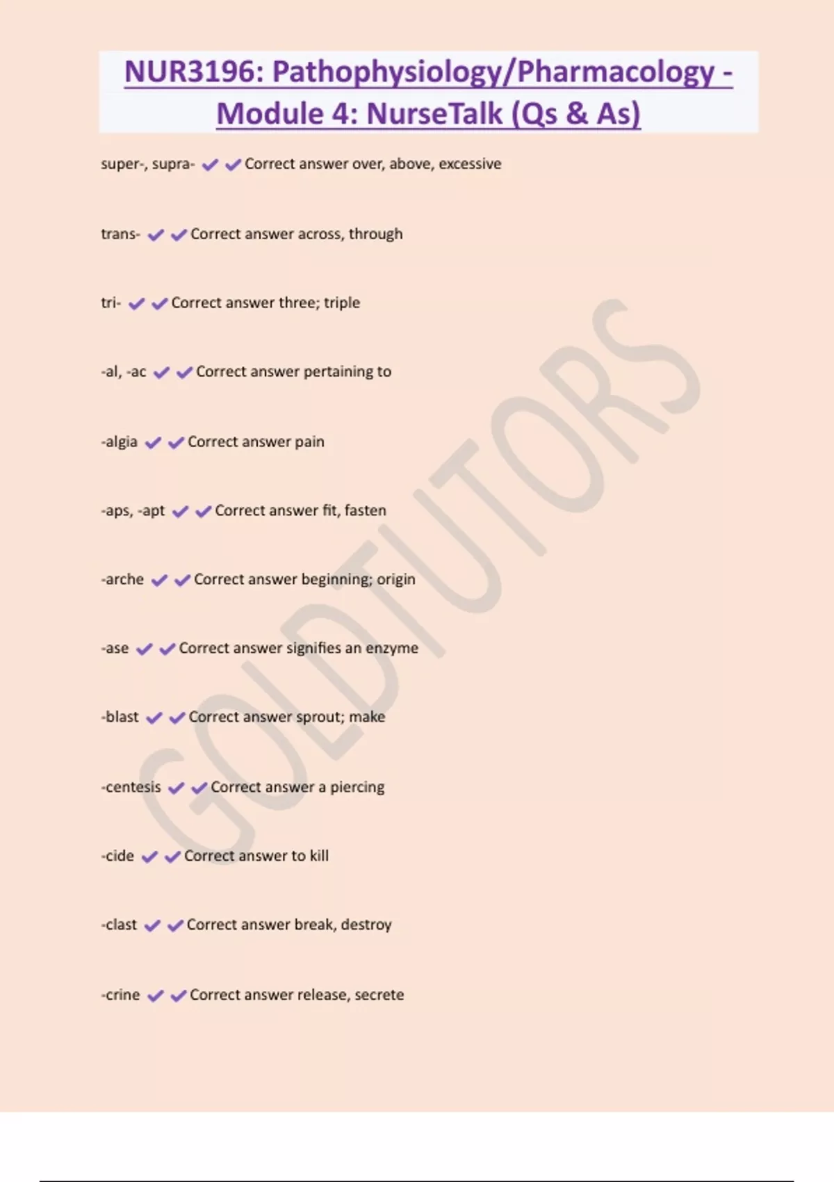 NUR3196: Pathophysiology/Pharmacology - Module 4: NurseTalk (Qs & As) super-, supra- Correct answer over, above, excessive trans- Correct answer across, through tri- Correct answer three; triple -al, -ac Correct answer pertaining to -algia Correct answer pain -aps, -apt Correct answer fit, fasten -arche Correct answer beginning; origin -ase Correct answer signifies an enzyme -blast Correct answer sprout; make