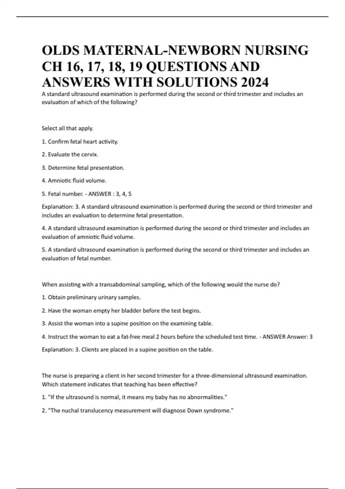 OLDS MATERNAL-NEWBORN NURSING CH 16, 17, 18, 19 QUESTIONS AND ANSWERS WITH SOLUTIONS 2024