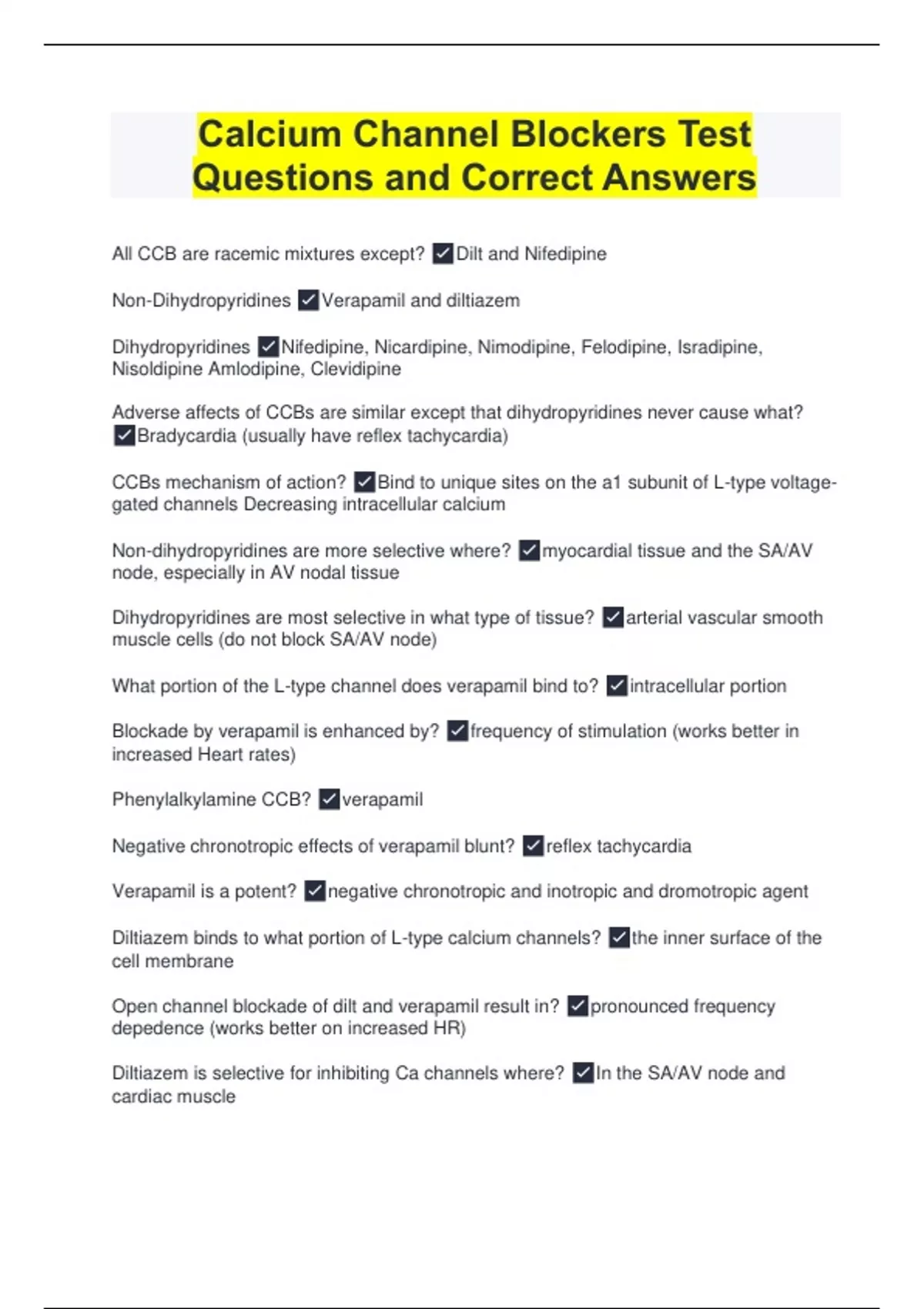 Calcium Channel Blockers Test Questions and Correct Answers