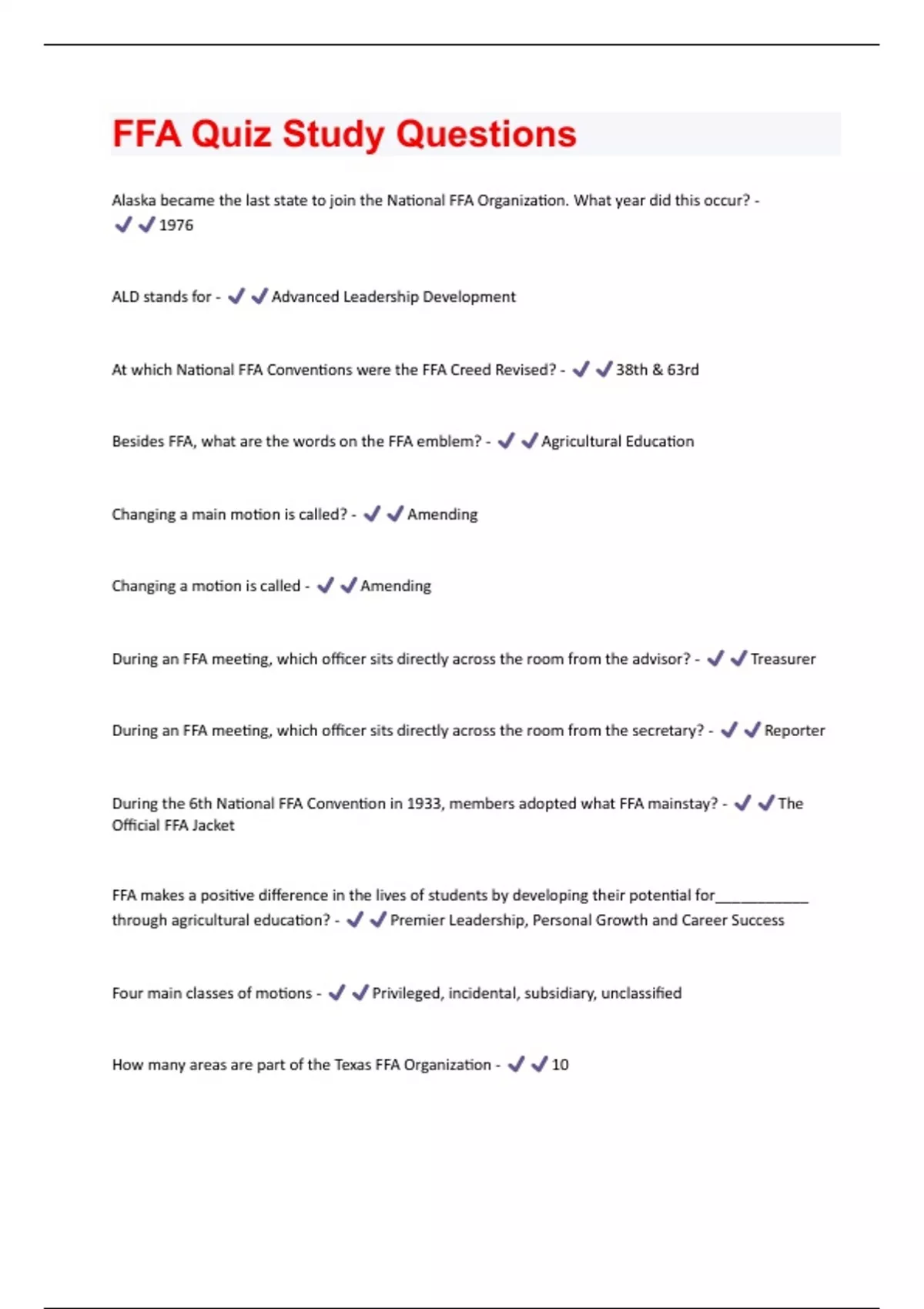 Alaska became the last state to join the National FFA Organization. What year did this occur? - 1976 ALD stands for - Advanced Leadership Development At which National FFA Conventions were the FFA Creed Revised? - 38th & 63rd Besides FFA, what are the words on the FFA emblem? - Agricultural Education Changing a main motion is called? - Amending Changing a motion is called - Amending During an FFA meeting, which officer sits directly across the room from the advisor? - Treasurer During an FFA meeting, which officer sits directly across the room from the secretary? - Reporter During the 6th National FFA Convention in 1933, members adopted what FFA mainstay? - The Official FFA Jacket FFA makes a positive difference in the lives of students by developing their potential for___________ through agricultural education? - Premier Leadership, Personal Growth and Career Success Four main classes of motions - Privileged, incidental, subsidiary, unclassified How many areas are part of the Texas FFA Organization - 10How many delegates attended the first National FFA Convention? - 33 How many districts are part of the Texas FFA Organization - 57 How many paragraphs are in the creed? - 5 How many Proficiency Award areas are at the National level? - 49