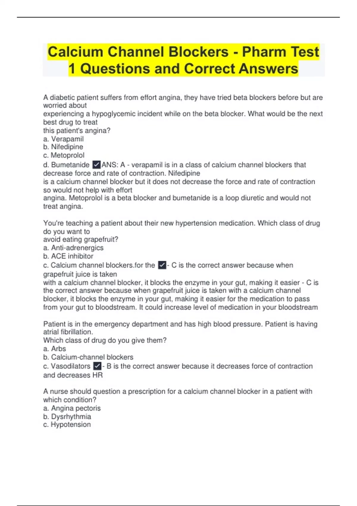 A diabetic patient suffers from effort angina, they have tried beta blockers before but are worried about experiencing a hypoglycemic incident while on the beta blocker. What would be the next best drug to treat this patient's angina? a. Verapamil b. Nifedipine c. Metoprolol d. Bumetanide ANS: A - verapamil is in a class of calcium channel blockers that decrease force and rate of contraction. Nifedipine is a calcium channel blocker but it does not decrease the force and rate of contraction so would not help with effort angina. Metoprolol is a beta blocker and bumetanide is a loop diuretic and would not treat angina. You're teaching a patient about their new hypertension medication. Which class of drug do you want to avoid eating grapefruit? a. Anti-adrenergics b. ACE inhibitor c. Calcium channel the - C is the correct answer because when grapefruit juice is taken with a calcium channel blocker, it blocks the enzyme in your gut, making it easier - C is the correct answer because when grapefruit juice is taken with a calcium channel blocker, it blocks the enzyme in your gut, making it easier for the medication to pass from your gut to bloodstream. It could increase level of medication in your bloodstream Patient is in the emergency department and has high blood pressure. Patient is having atrial fibrillation. Which class of drug do you give them? a. Arbs b. Calcium-channel blockers c. Vasodilators - B is the correct answer because it decreases force of contraction and decreases HR A nurse should question a prescription for a calcium channel blocker in a patient with which condition? a. Angina pectoris b. Dysrhythmia c. Hypotension