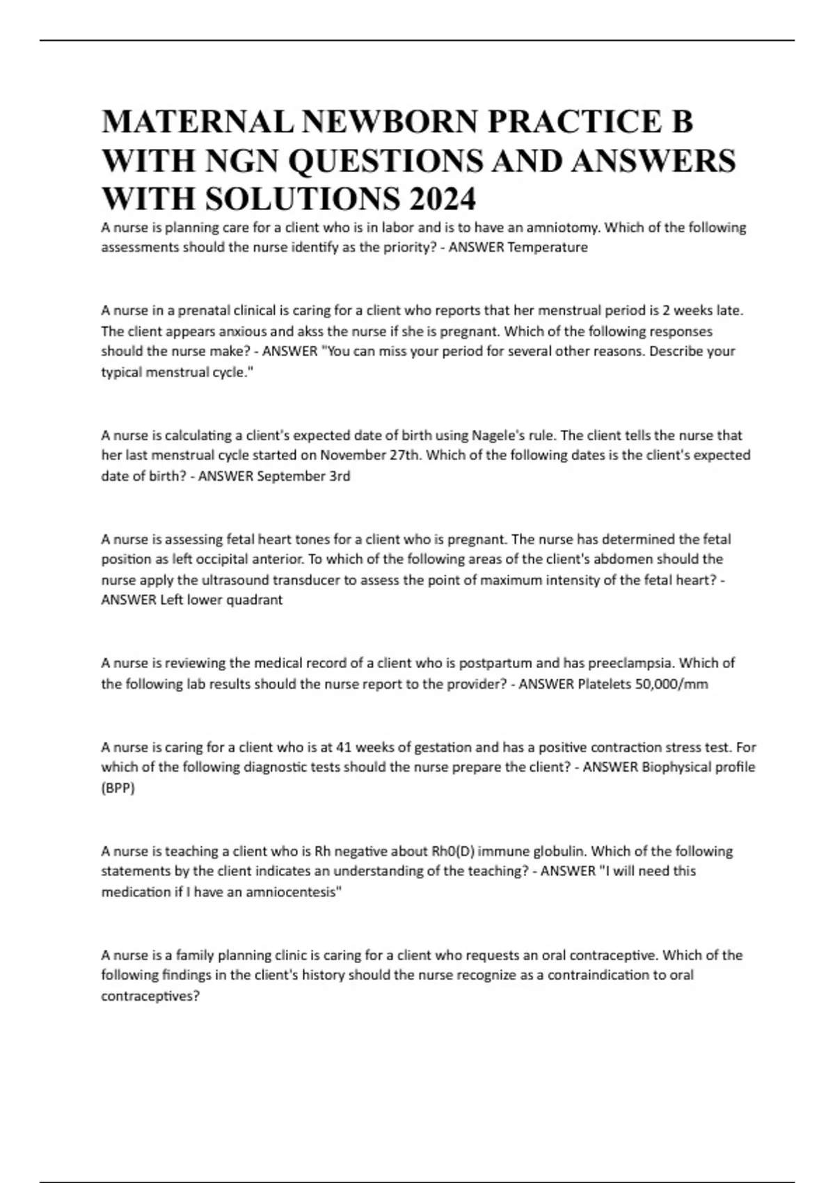 MATERNAL NEWBORN PRACTICE B WITH NGN QUESTIONS AND ANSWERS WITH SOLUTIONS 2024