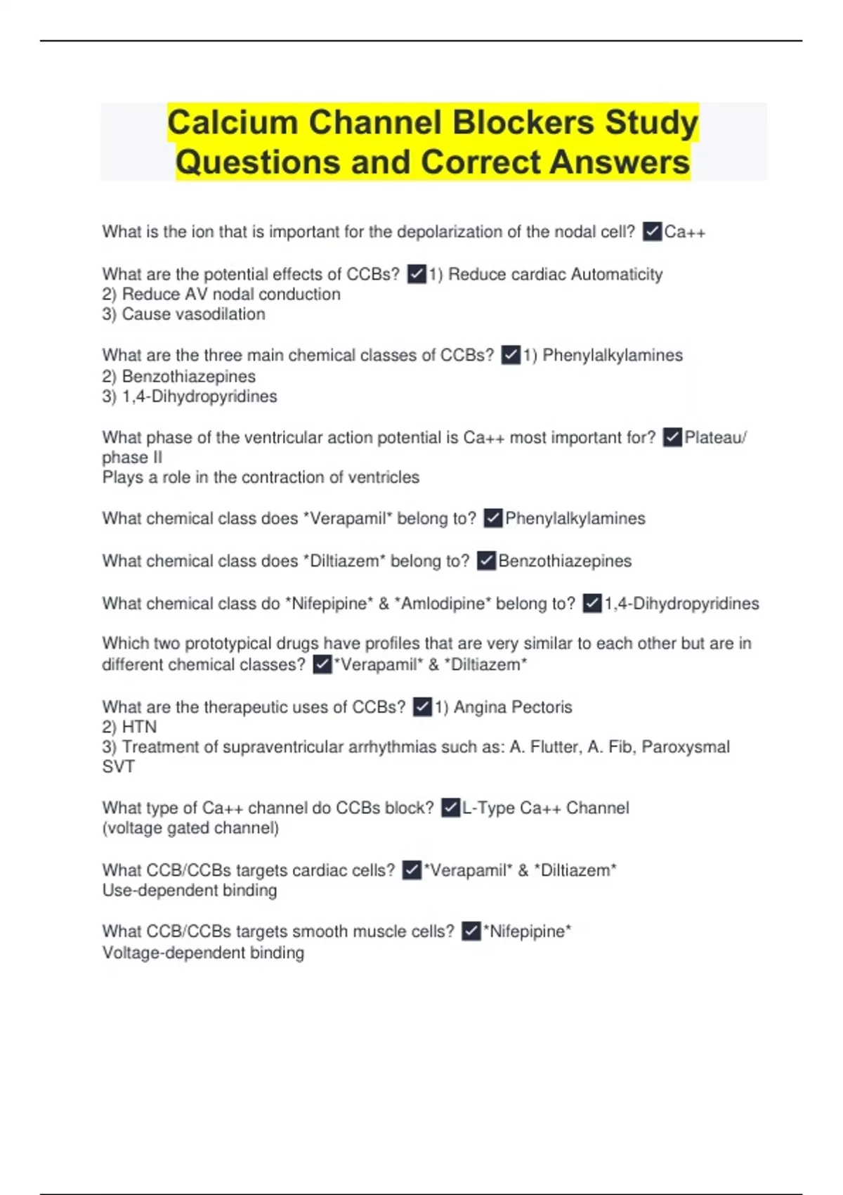 Calcium Channel Blockers Study Questions and Correct Answers