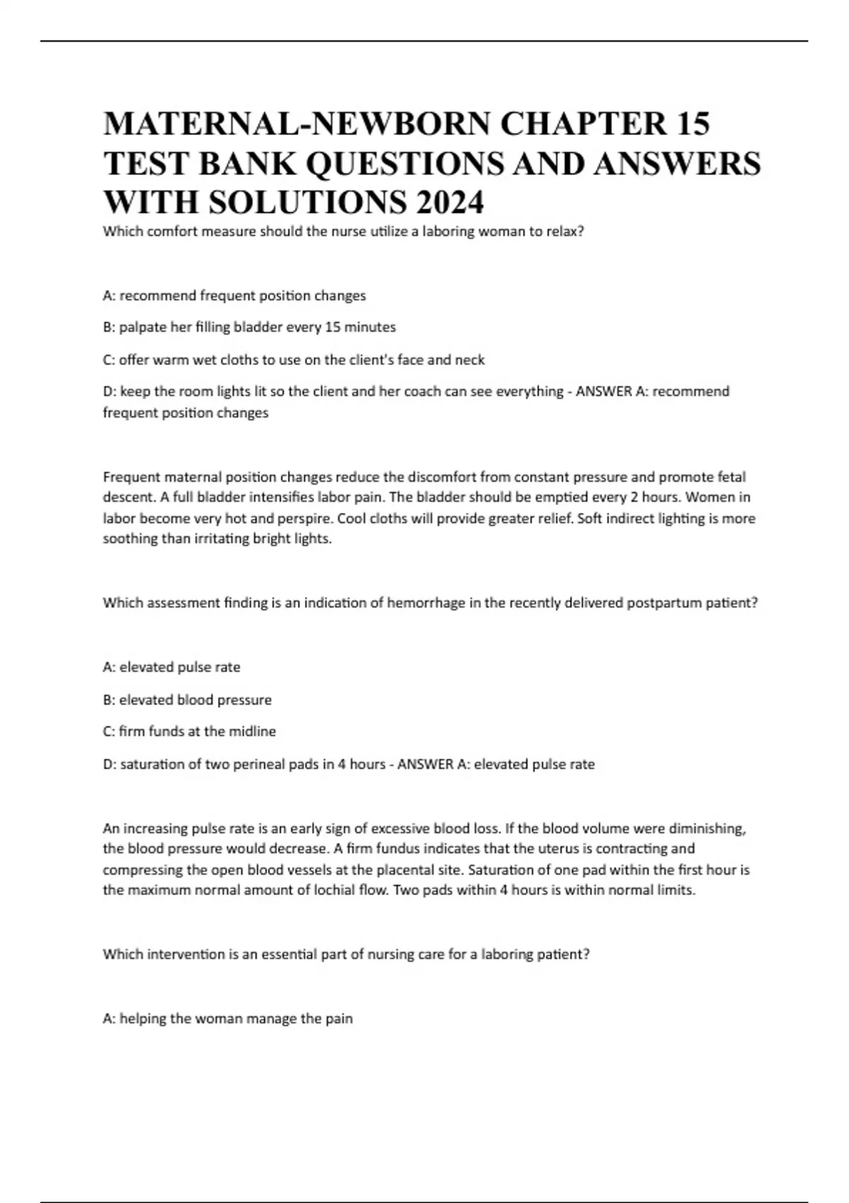 MATERNAL-NEWBORN CHAPTER 15 TEST BANK QUESTIONS AND ANSWERS WITH SOLUTIONS 2024