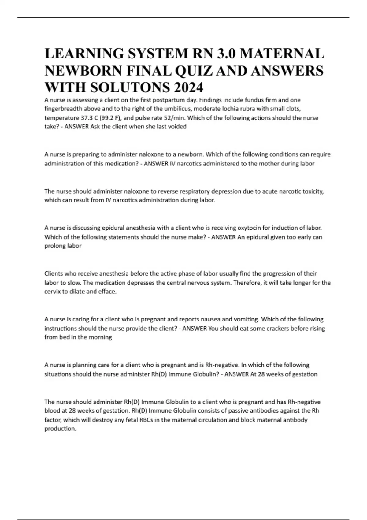 LEARNING SYSTEM RN 3.0 MATERNAL NEWBORN FINAL QUIZ AND ANSWERS WITH SOLUTONS 2024