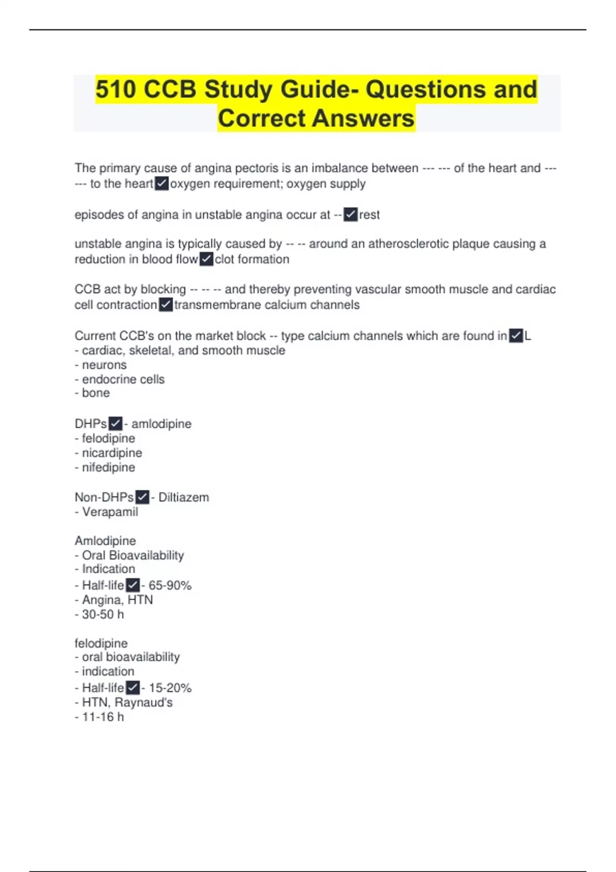 The primary cause of angina pectoris is an imbalance between --- --- of the heart and --- --- to the heartoxygen requirement; oxygen supply episodes of angina in unstable angina occur at --rest unstable angina is typically caused by -- -- around an atherosclerotic plaque causing a reduction in blood flowclot formation CCB act by blocking -- -- -- and thereby preventing vascular smooth muscle and cardiac cell contractiontransmembrane calcium channels Current CCB's on the market block -- type calcium channels which are found inL - cardiac, skeletal, and smooth muscle - neurons - endocrine cells - bone DHPs- amlodipine - felodipine - nicardipine - nifedipine Non-DHPs- Diltiazem - Verapamil Amlodipine - Oral Bioavailability - Indication - Half-life- 65-90% - Angina, HTN - 30-50 h felodipine - oral bioavailability - indication - Half-life- 15-20% - HTN, Raynaud's - 11-16 h nicardipine - oral bioavailability - indication - half-life- 35% - Angina, HTN