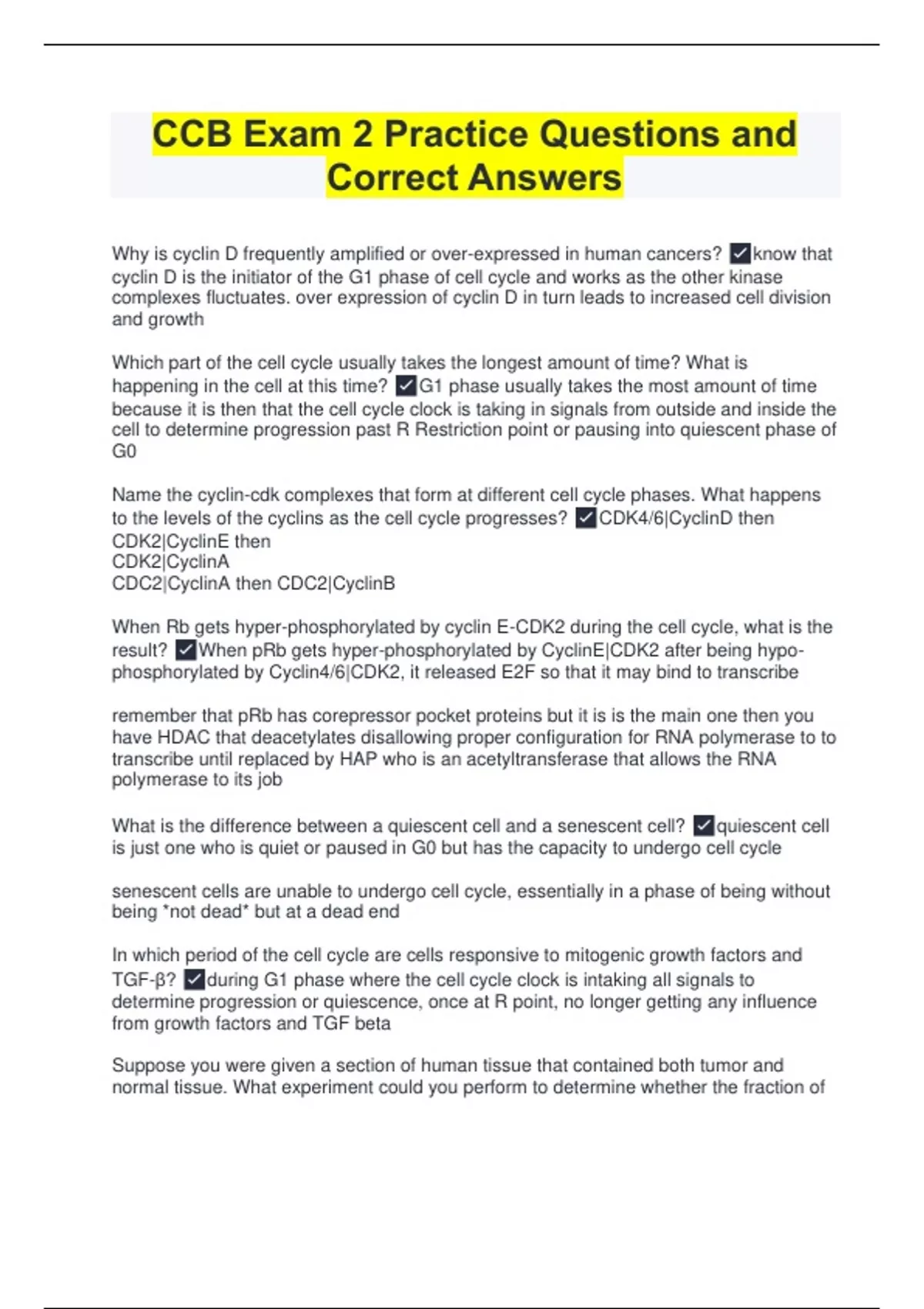 Why is cyclin D frequently amplified or over-expressed in human cancers? know that cyclin D is the initiator of the G1 phase of cell cycle and works as the other kinase complexes fluctuates. over expression of cyclin D in turn leads to increased cell division and growth Which part of the cell cycle usually takes the longest amount of time? What is happening in the cell at this time? G1 phase usually takes the most amount of time because it is then that the cell cycle clock is taking in signals from outside and inside the cell to determine progression past R Restriction point or pausing into quiescent phase of G0 Name the cyclin-cdk complexes that form at different cell cycle phases. What happens to the levels of the cyclins as the cell cycle progresses? CDK4/6|CyclinD then CDK2|CyclinE then CDK2|CyclinA CDC2|CyclinA then CDC2|CyclinB When Rb gets hyper-phosphorylated by cyclin E-CDK2 during the cell cycle, what is the result? When pRb gets hyper-phosphorylated by CyclinE|CDK2 after being hypo-phosphorylated by Cyclin4/6|CDK2, it released E2F so that it may bind to transcribe remember that pRb has corepressor pocket proteins but it is is the main one then you have HDAC that deacetylates disallowing proper configuration for RNA polymerase to to transcribe until replaced by HAP who is an acetyltransferase that allows the RNA polymerase to its job What is the difference between a quiescent cell and a senescent cell? quiescent cell is just one who is quiet or paused in G0 but has the capacity to undergo cell cycle senescent cells are unable to undergo cell cycle, essentially in a phase of being without being *not dead* but at a dead end In which period of the cell cycle are cells responsive to mitogenic growth factors and TGF-β? during G1 phase where the cell cycle clock is intaking all signals to determine progression or quiescence, once at R point, no longer getting any influence from growth factors and TGF beta Suppose you were given a section of human tissue that contained both tumor and normal tissue. What experiment could you perform to determine whether the fraction of cells passing the R-point in tumors was higher than normal tissue? immunochemistry or stain to determine inhibitor proteins that would haunt progression, no inhibitor proteins then probably cancerous with higher levels of cells passing R point into progression than in normal tissue
