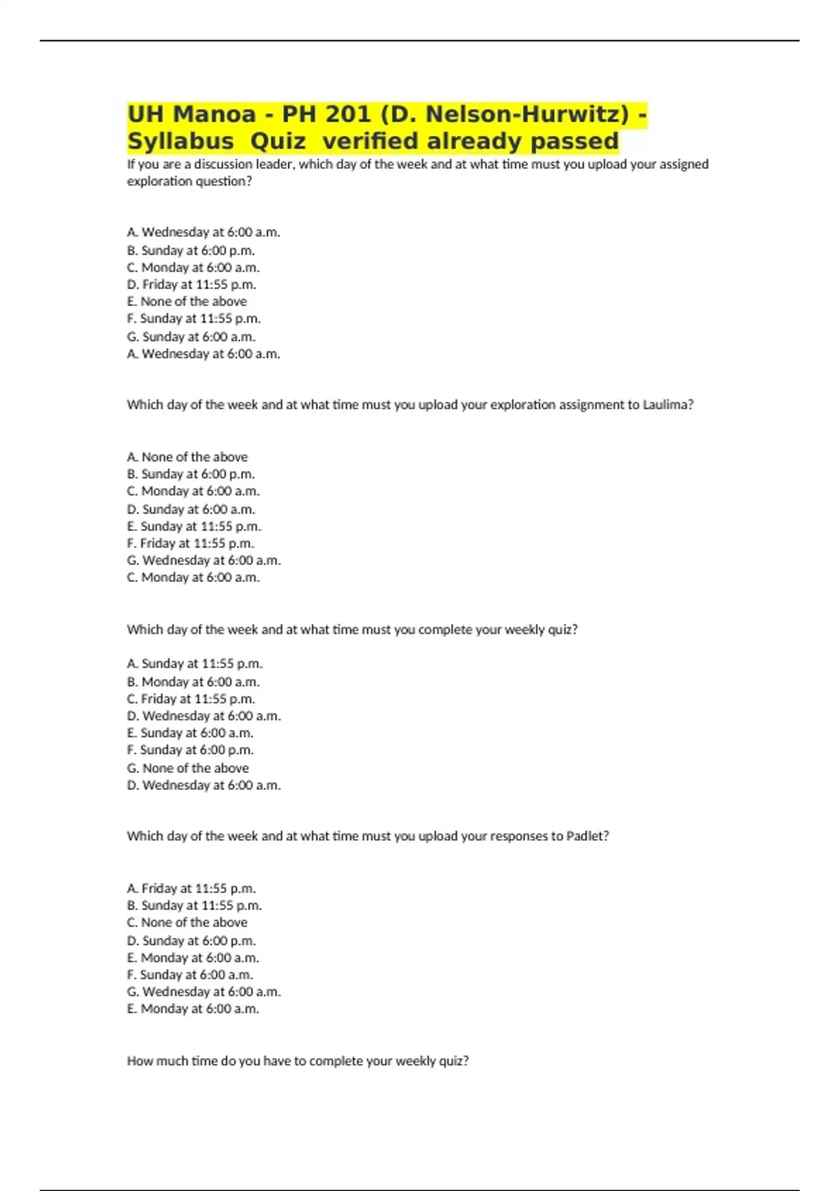 UH Manoa - PH 201 (D. Nelson-Hurwitz) -Syllabus Quiz verified already passed If you are a discussion leader, which day of the week and at what time must you upload your assigned exploration question? A. Wednesday at 6:00 a.m. B. Sunday at 6:00 p.m. C. Monday at 6:00 a.m. D. Friday at 11:55 p.m. E. None of the above F. Sunday at 11:55 p.m. G. Sunday at 6:00 a.m. A. Wednesday at 6:00 a.m. Which day of the week and at what time must you upload your exploration assignment to Laulima? A. None of the above B. Sunday at 6:00 p.m. C. Monday at 6:00 a.m. D. Sunday at 6:00 a.m. E. Sunday at 11:55 p.m. F. Friday at 11:55 p.m. G. Wednesday at 6:00 a.m. C. Monday at 6:00 a.m. Which day of the week and at what time must you complete your weekly quiz? A. Sunday at 11:55 p.m. B. Monday at 6:00 a.m. C. Friday at 11:55 p.m. D. Wednesday at 6:00 a.m. E. Sunday at 6:00 a.m. F. Sunday at 6:00 p.m. G. None of the above D. Wednesday at 6:00 a.m. Which day of the week and at what time must you upload your responses to Padlet? A. Friday at 11:55 p.m. B. Sunday at 11:55 p.m. C. None of the above D. Sunday at 6:00 p.m. E. Monday at 6:00 a.m. F. Sunday at 6:00 a.m. G. Wednesday at 6:00 a.m. E. Monday at 6:00 a.m. How much time do you have to complete your weekly quiz? A. 1 day B. 2 days C. 3 days D. 1 week E. none of the above B. 2 days If you are a discussion leader, you must upload the solution to your assigned exploration question on ___ (day of the week). A. Sunday B. Monday