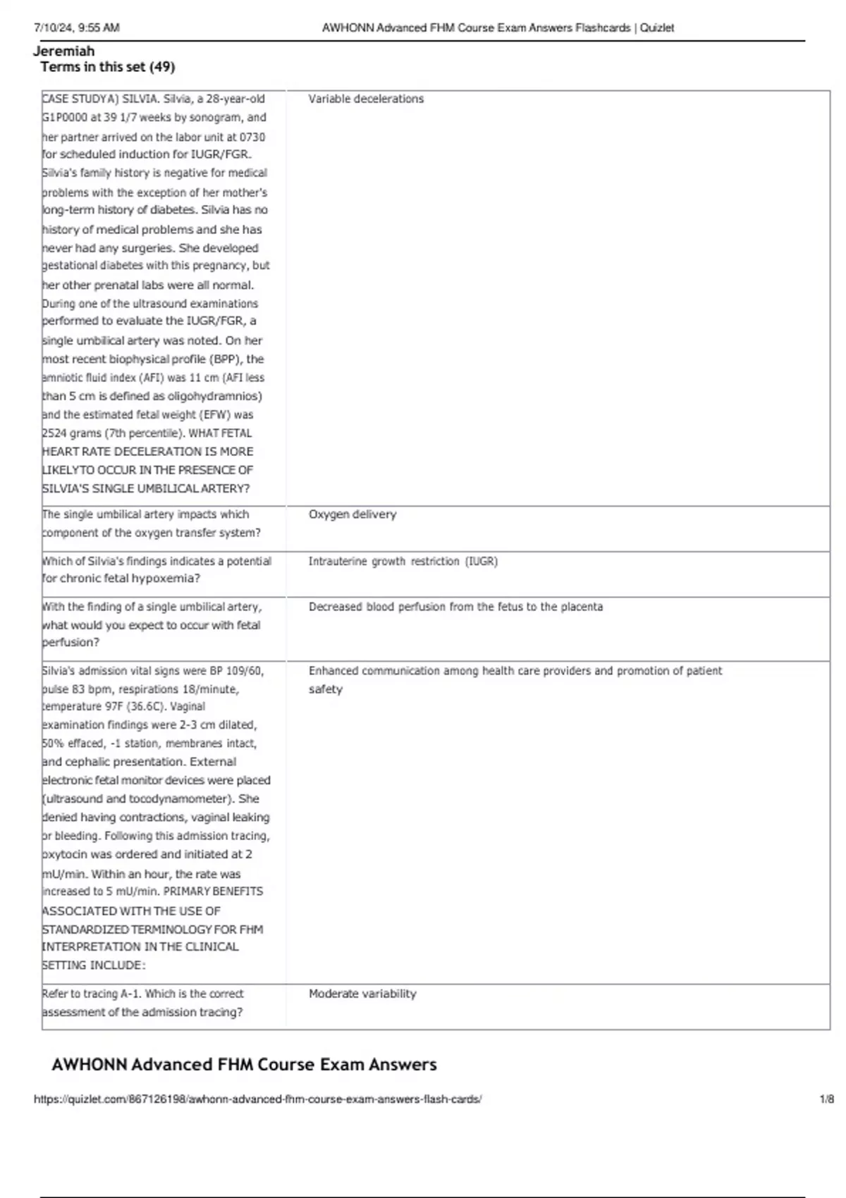 AWHONN Advanced FHM Course Exam Answers Flashcards _ Complete Questions & A