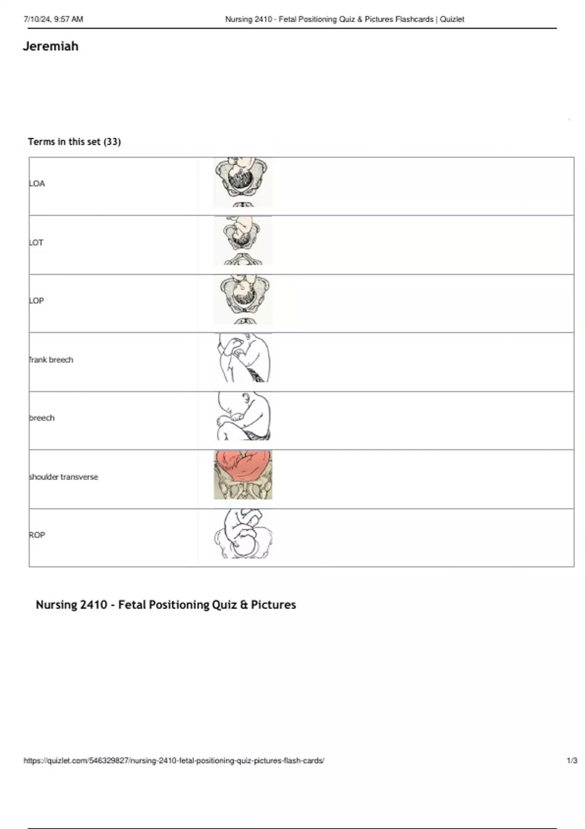 Nursing 2410 - Fetal Positioning Quiz & Pictures Flashcards _ Complete Questions & A