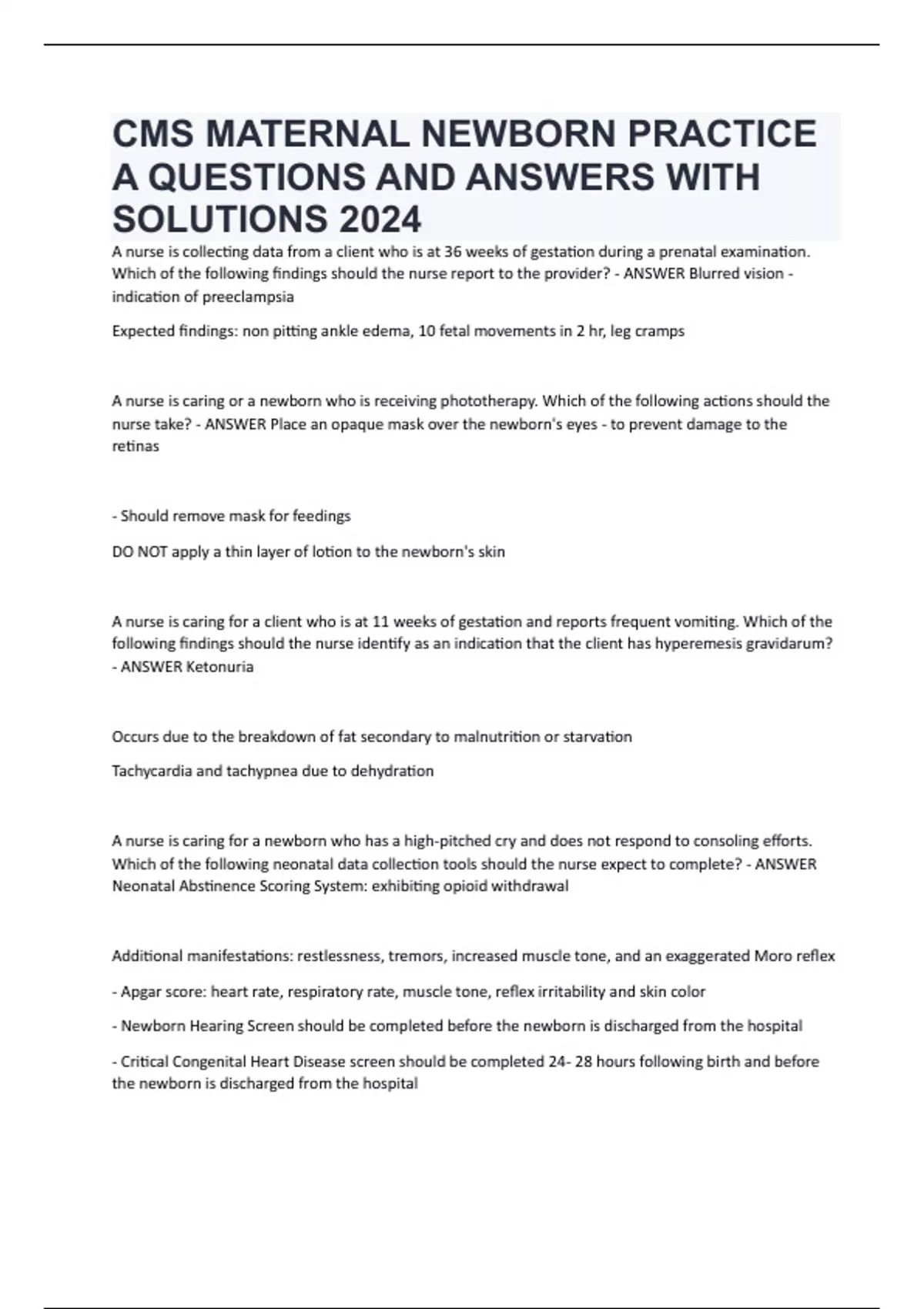 CMS MATERNAL NEWBORN PRACTICE A QUESTIONS AND ANSWERS WITH SOLUTIONS 2024