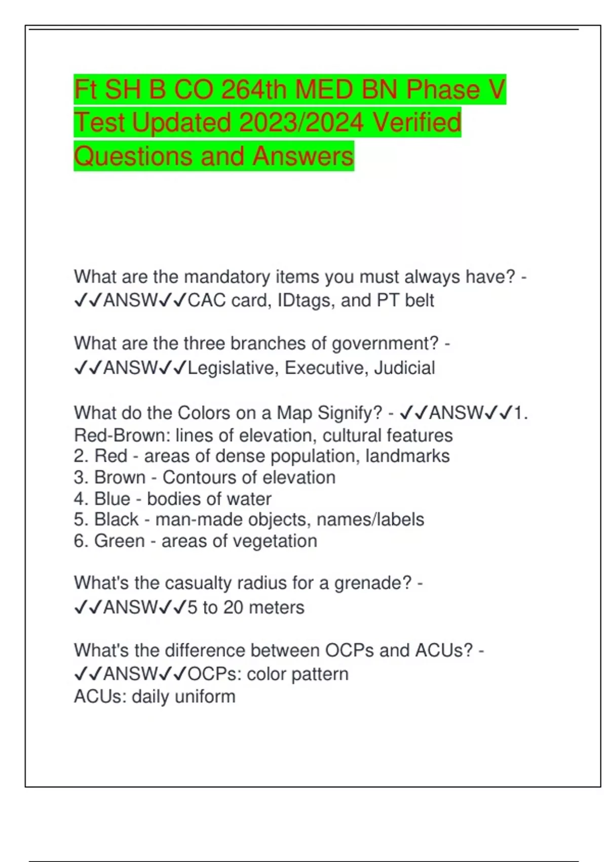 Ft SH B CO 264th MED BN Phase V Test Updated 2023/2024 Verified Questions and Answers